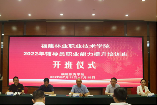 本网讯 7月11日上午,我院2022年辅导员职业能力提升培训班在福建教育学院开班。院党委书记万泉、福建教育学院副院长官明辉、院党委副书记严绍裕、院学生工作部部长蔡敏出席开班仪式。各系学生科科长、全体专职辅导员参加开班仪式。仪式由福建教育学院职业教育部副主任傅振南主持。