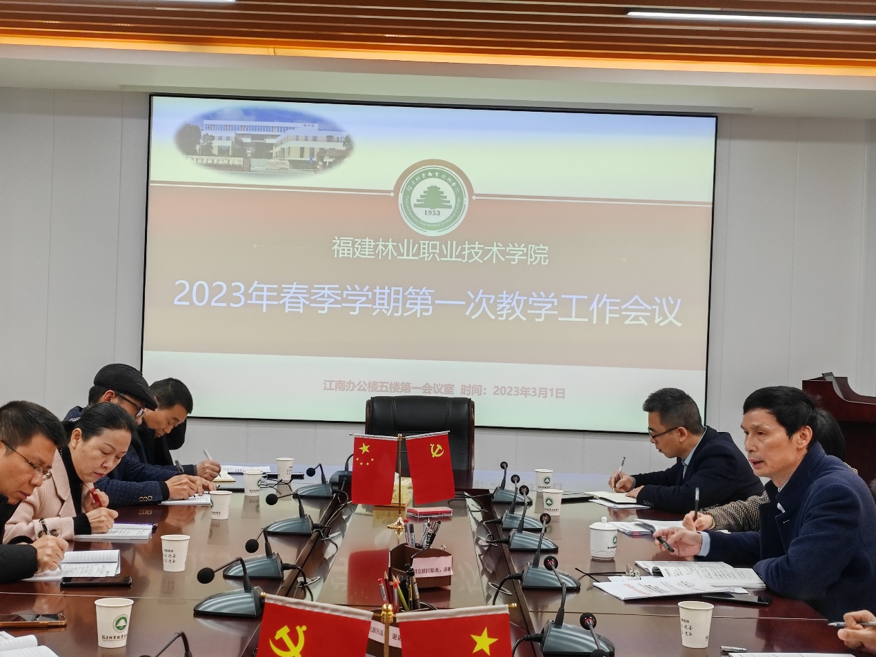 本网讯 为深入学习贯彻党的二十大精神,落实省委省政府“深学争优、敢为争先、实干争效”行动部署,3月1日上午,学院在江南校区行政楼5楼第一会议室召开“争优争先争效——学院2023年春季学期第一次教学工作会议”。会议由谢金生副院长主持。院长刘文开、教务处处长黄云玲、实训中心主任黄勤坚、现代教育技术中心主任郑金兴、图书馆馆长成榕、科研与交流合作处处长方栋龙、马克思主义学院院长郭先根、公共教学部部长徐洪、各系主任,教务处相关人员出席了会议。