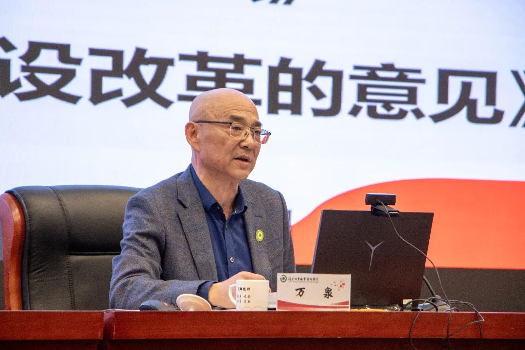 万泉强调,党的二十大擘画了全面建设社会主义现代化国家、以中国式现代化全面推进中华民族伟大复兴的宏伟蓝图,我们由此迎来了又一个新的春天。作为教育系统,要深刻领会党的二十大关于教育的战略部署,强化教育、科技、人才统筹,加快推进教育现代化。万泉带领全院师生一起系统梳理了二十大关于教育问题的创新理论与观点:一是充分肯定了十年来中国教育的成就;二是强调了教育的战略地位;三是重申了党的教育方针;四是全面部署了加快建设高质量教育体系,办好人民满意的教育。