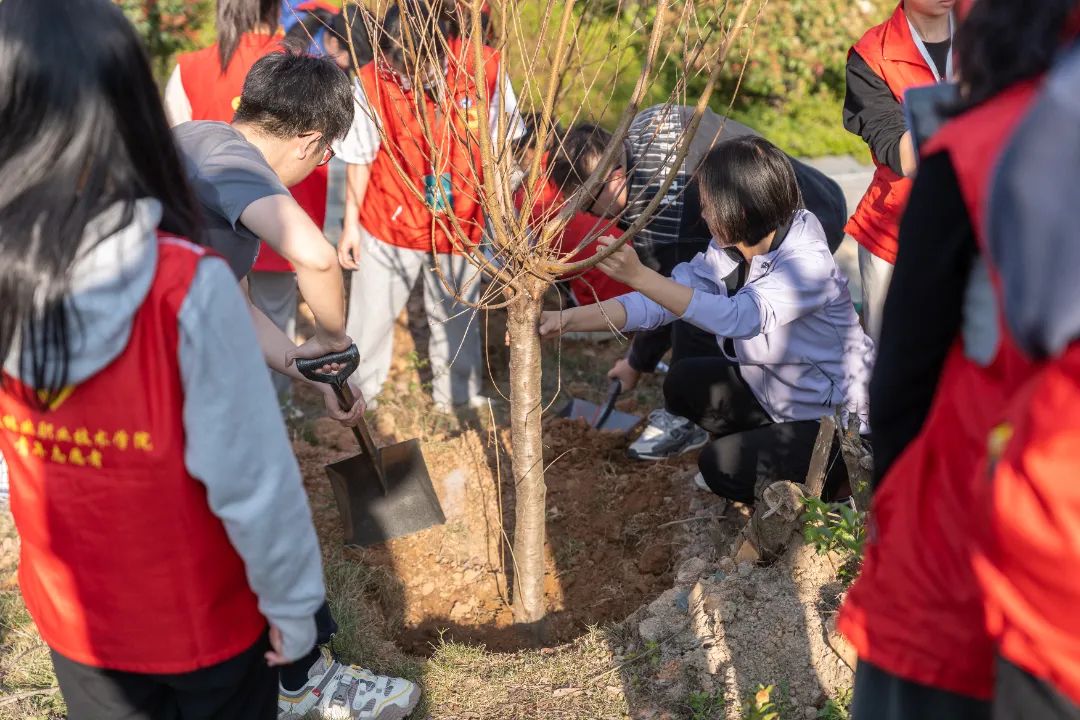 仪式结束后,师生来到“龙景山大学生劳动教育实践基地”开展2023年校园植树主题党团日活动。植树现场,师生们干劲十足,配合默契。大家将一棵棵树苗植入新坑,挥锹铲土,扶正苗木,培土踩实,围堰浇水,为校园增添绿色,用自己的双手为学院播种绿意,用自己的行动和汗水充分展现了林职院师生的良好风貌与责任担当。