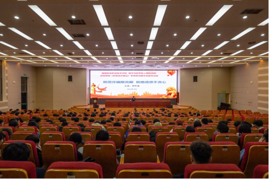本网讯 4月6日晚,院纪委办公室、安全保卫处联合南平市延平区人民检察院在江南校区图书馆报告厅举办宣传贯彻《反电信诈骗法》专项暨清廉文化教育活动。本次活动邀请了南平市延平区人民检察院第二检察部副主任、检察官罗作湍同志作《防范诈骗擦亮眼拒绝诱惑不贪心》讲座,共500余名师生到场聆听。