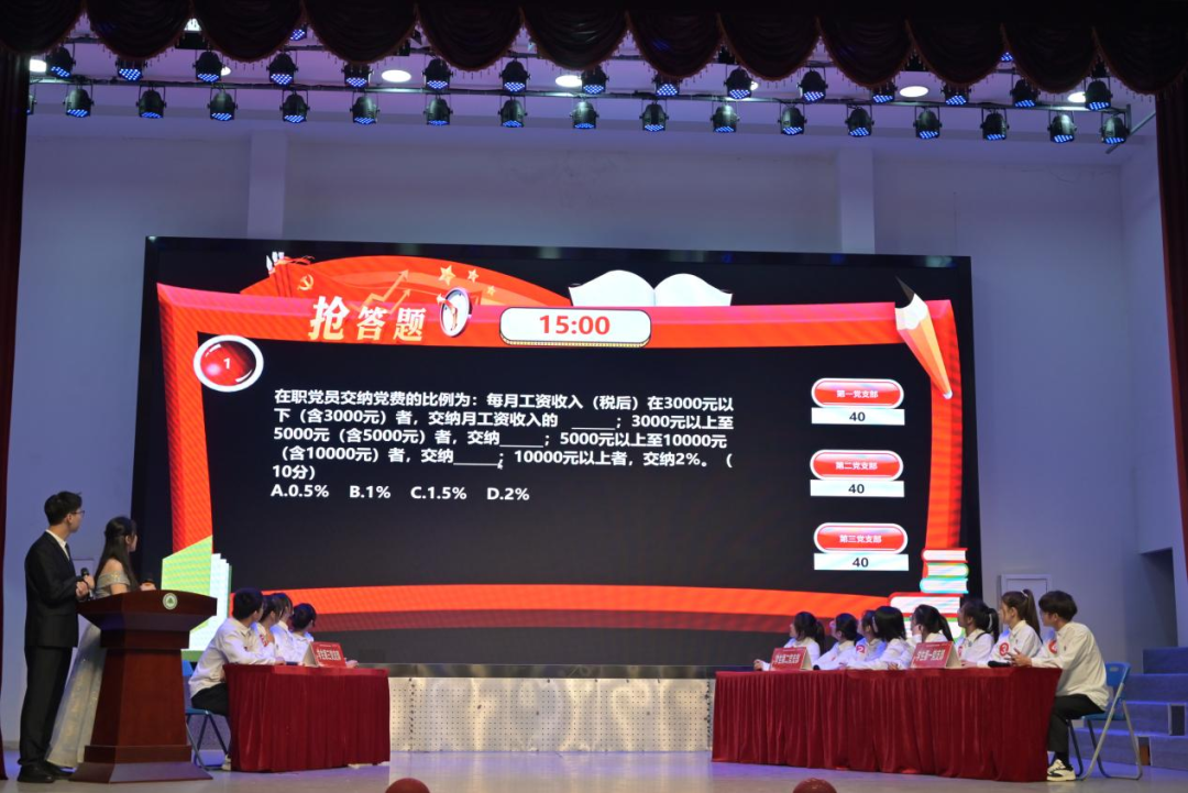 场上,参赛选手们各个精神饱满、热情高涨,赛场气氛紧张激烈,在必答题环节,各队凭借丰富的党建知识积累均拿到了满分,在抢答环节中,各队你追我赶,难分伯仲,在风险题环节中,三支队伍机智沉着地答题,当支部团队选择高分值题时,更是让现场的观众紧紧捏了一把汗,将党建知识竞赛活动推向了高潮。场下智囊团在本支部答题遇到瓶颈时的及时助力,更是获得了台上台下的一阵阵掌声。