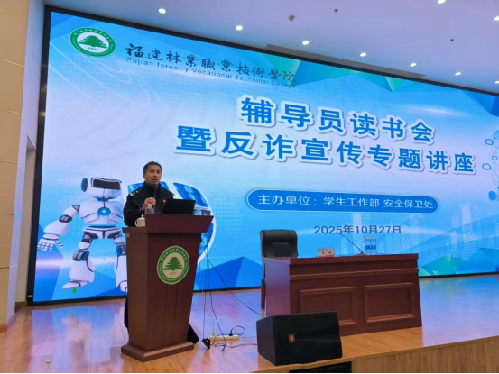 本网讯 为深化辅导员队伍育人能力建设,筑牢师生防范电信网络诈骗“思想防线”,10月27日下午,学院学生工作部、安全保卫处在江南校区图书馆学术报告厅联合举办辅导员读书会暨反诈宣传专题讲座。学院党委副书记严绍裕出席并作部署讲话,延平公安分局反诈机制办王骁警官作专宣讲,夏道派出所副所长兰火明、学生工作部副部长陈红英、安全保卫处综合科科长刘旭晖、各系党总支副书记、学生科长负责人、全体辅导员各系学生代表参加,学生工作部学生教育管理科科长温全军主持
