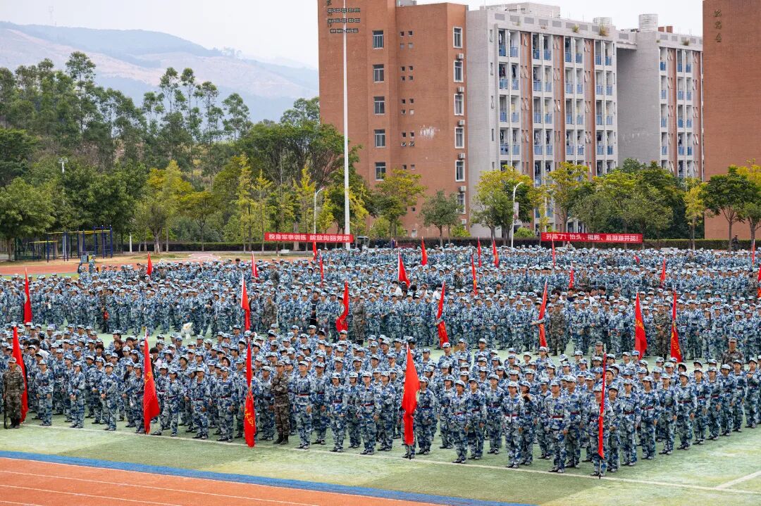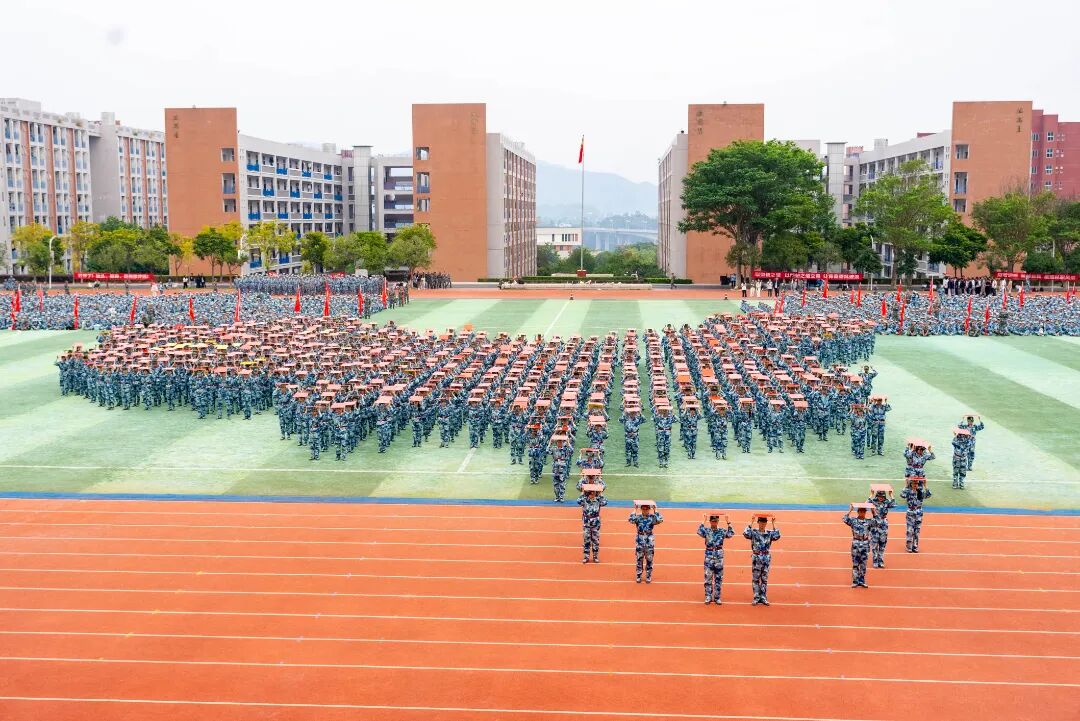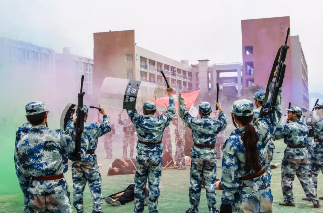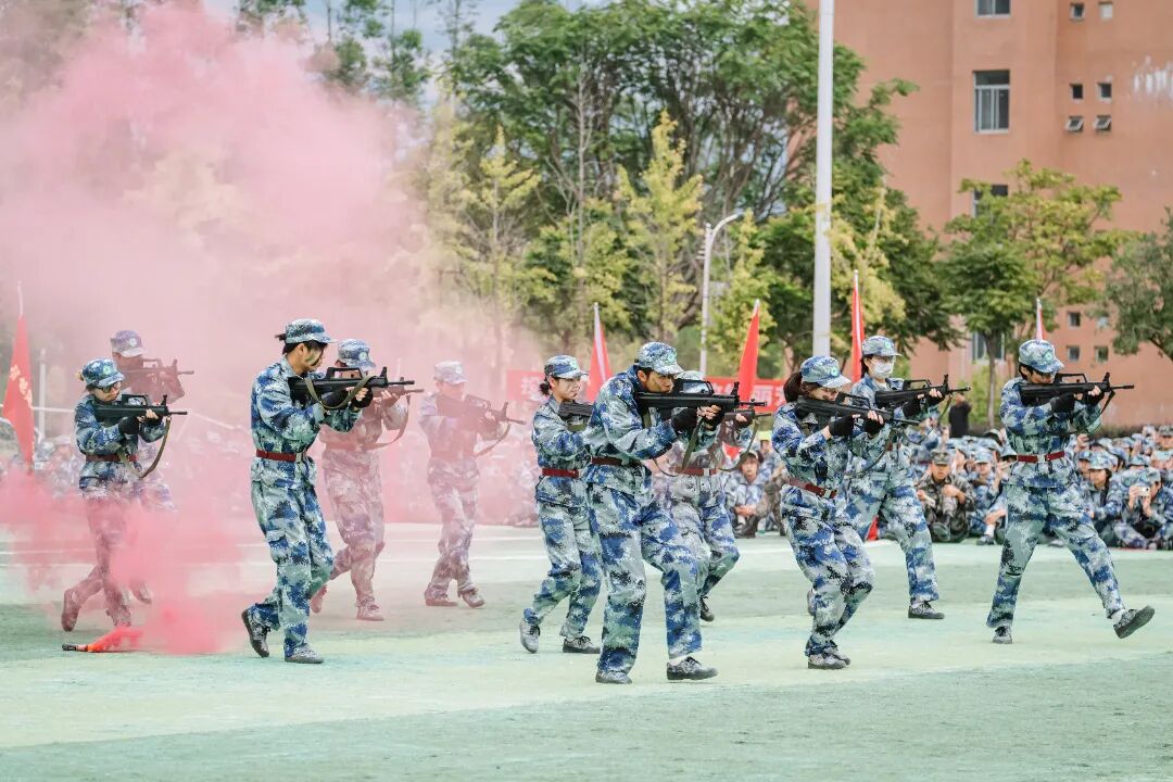 特色军事科目表演环节将现场气氛推向高潮。军体拳方阵拳脚生风,招式刚劲有力;匕首操表演动作整齐划一,突刺迅猛,尽显巾帼风采与飒爽英姿;刺杀操方阵吼声震天,一攻一防间展现出不屈的战斗意志;战术表演模拟战场环境,队员们协同配合,动作干脆利落,硝烟弥漫中彰显了坚毅果敢的拼搏精神,赢得了现场师生的阵阵掌声。