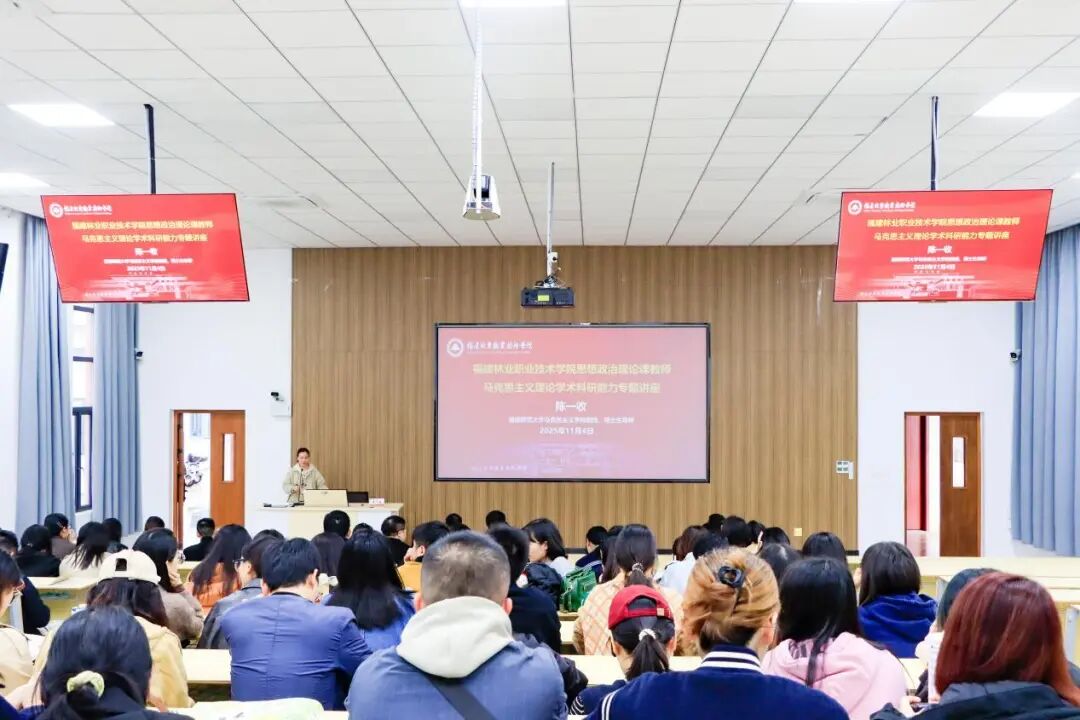 本网讯 为深入贯彻落实立德树人根本任务,进一步提升学院思政课教师和辅导员队伍的马克思主义理论学术科研能力,助力学院思想政治教育工作高质量发展,2025年11月4日下午,学院特邀福建师范大学马克思主义学院博士生导师陈一收教授莅临我院,作题为《做好马克思主义理论学科学术科研的感悟和理解》的专题讲座。讲座由宣传部部长、马克思主义学院院长邹小燕主持,学院全体专兼职思政课教师和辅导员参加了本次学习。
