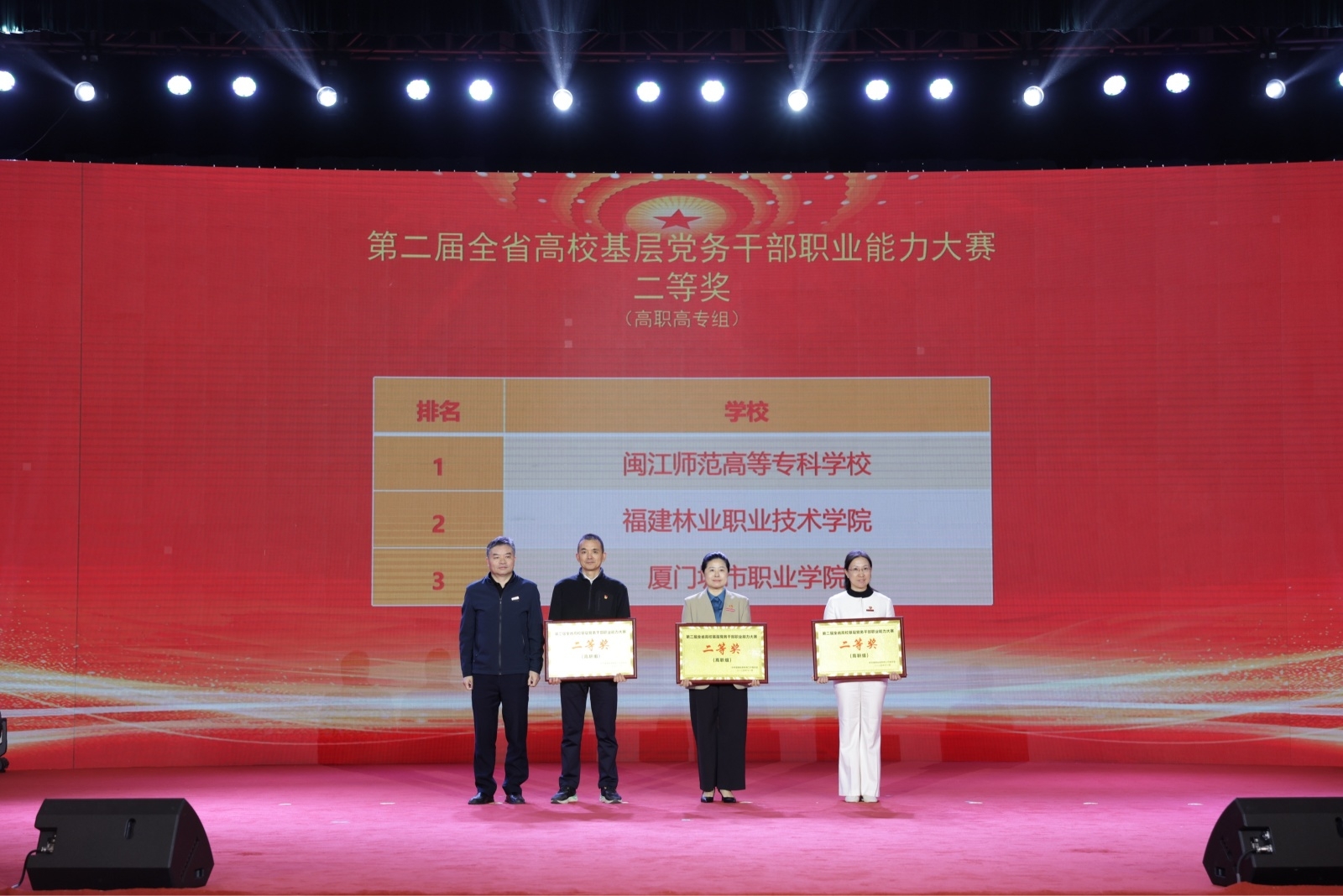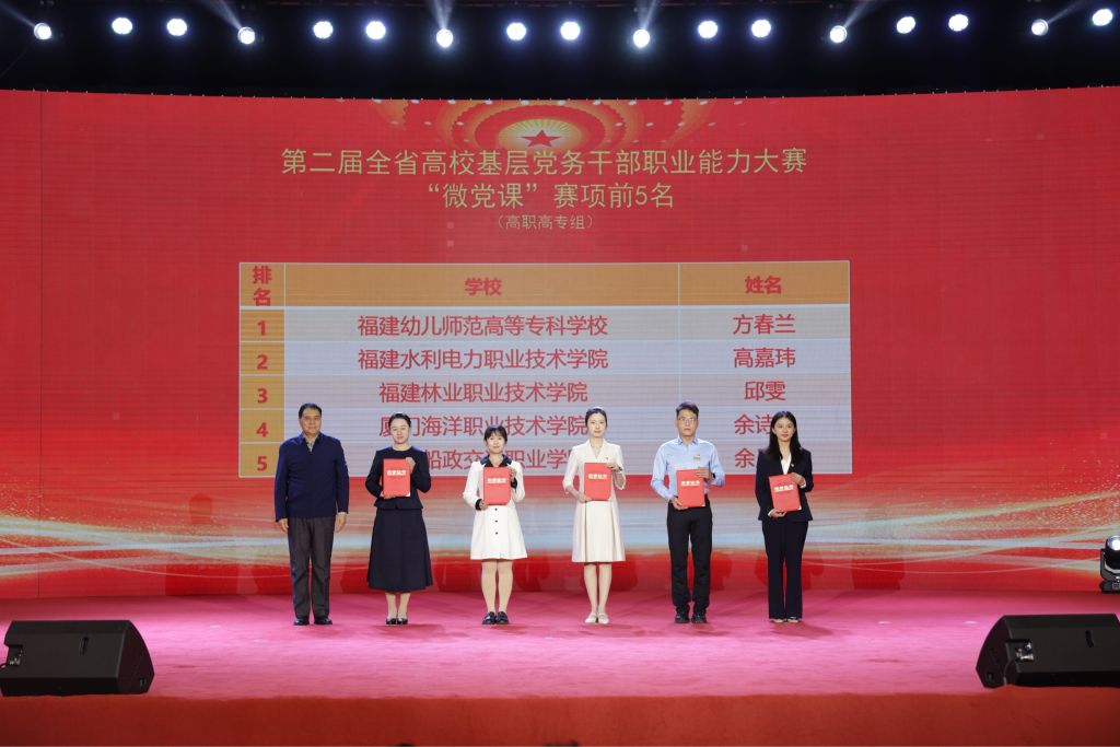 本网讯 11月28日,由福建省委教育工委主办、福建师范大学承办的福建省第二届高校基层党务干部职业能力大赛圆满落下帷幕。福建林业职业技术学院代表队在全省43所高职高专院校、129名选手的激烈角逐中脱颖而出,在该项赛事中喜获佳绩,获高职高专组团体二等奖,同时在“主题党日策划”“知识测试”“微党课”赛项中揽获3个单项奖,邱雯获高职高专组“微党课”赛项第3名,倪海奔获高职高专组“知识测试”赛项第5名,黄雪媛等主题党日策划作品获高职高专组“主题党日活动策划”赛项第10名,“谈心谈话”赛项代表队总分名列第3,实现了学院在该项赛事中的新突破。