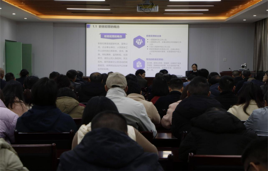 首先,李法官系统讲解了职务犯罪的概念、特点,结合职务犯罪典型案例,对职务犯罪的类型、原因分析、立案标准进行了深入讲解,并提出了防范职务犯罪的方法。她强调,避免职务犯罪应自觉抵制各种违法违纪利益的诱惑,严守预防腐败的“三道防线”,时刻牢记“五慎”;做到政治上把握住方向,感情上把握住原则,行动上把握住分寸,生活上把握住小节。