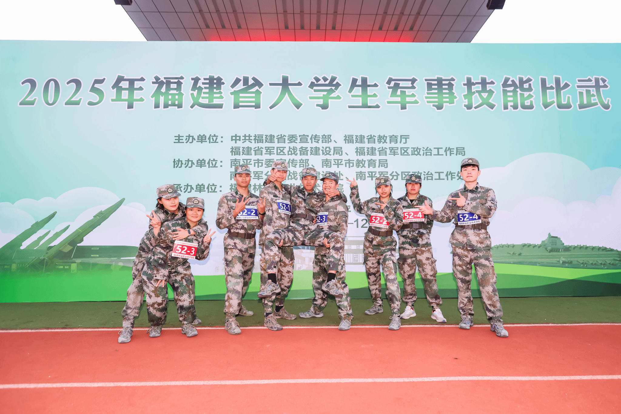 本次福建省大学生军事技能比武是全省高校国防教育成果的重要展示平台,吸引了全省72所高校代表队近600名选手同台竞技。赛事设置电磁频谱管控、战术基础动作、手榴弹定点投掷、识图用图、战场医疗救护、轻武器实弹射击六个实战化赛项,全面考验参赛选手的军事技能、协同配合与应急处置能力。我院作为承办单位,精心筹备赛事组织、场地保障、后勤服务等各项工作,以高标准、高质量的保障水平赢得了各参赛高校师生的一致好评。
