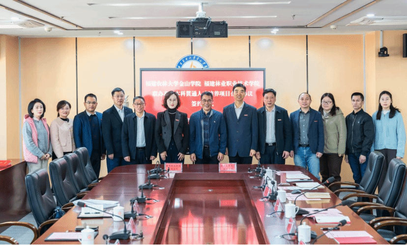 本网讯 为深入贯彻习近平总书记在全国教育大会上的重要讲话精神,全面落实《国家职业教育改革实施方案》《关于推动现代职业教育高质量发展的意见》《关于深化现代职业教育体系建设改革的意见》等部署,推进职业教育纵向贯通,拓宽学生成长成才通道,2025年12月29日,福建林业职业技术学院与福建农林大学金山学院联办高职本科贯通人才培养项目合作协议签约仪式在福建农林大学金山学院成功举行。签约仪式由福建农林大学金山学院党委委员、副院长坚瑞(主持工作)主持。福建农林大学党委常委、副校长林庆藩,福建农林大学金山学院党委常务副书记陈毅,福建林业职业技术学院党委书记陈建辉等出席签约仪式。
