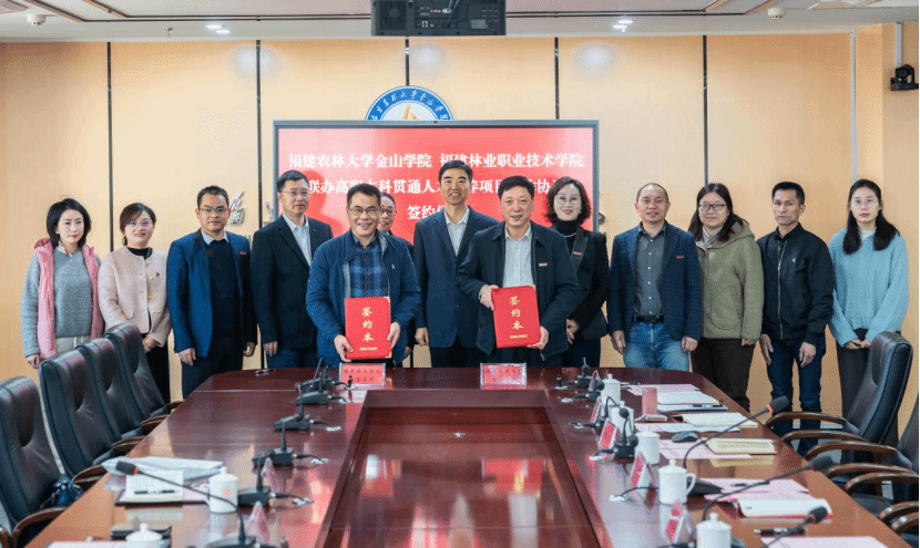 仪式上,福建农林大学金山学院党委常务副书记陈毅与福建林业职业技术学院党委书记陈建辉签订了《福建农林大学金山学院与福建林业职业技术学院联办高职本科贯通人才培养项目合作协议》。