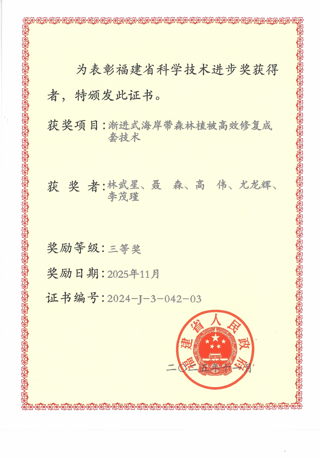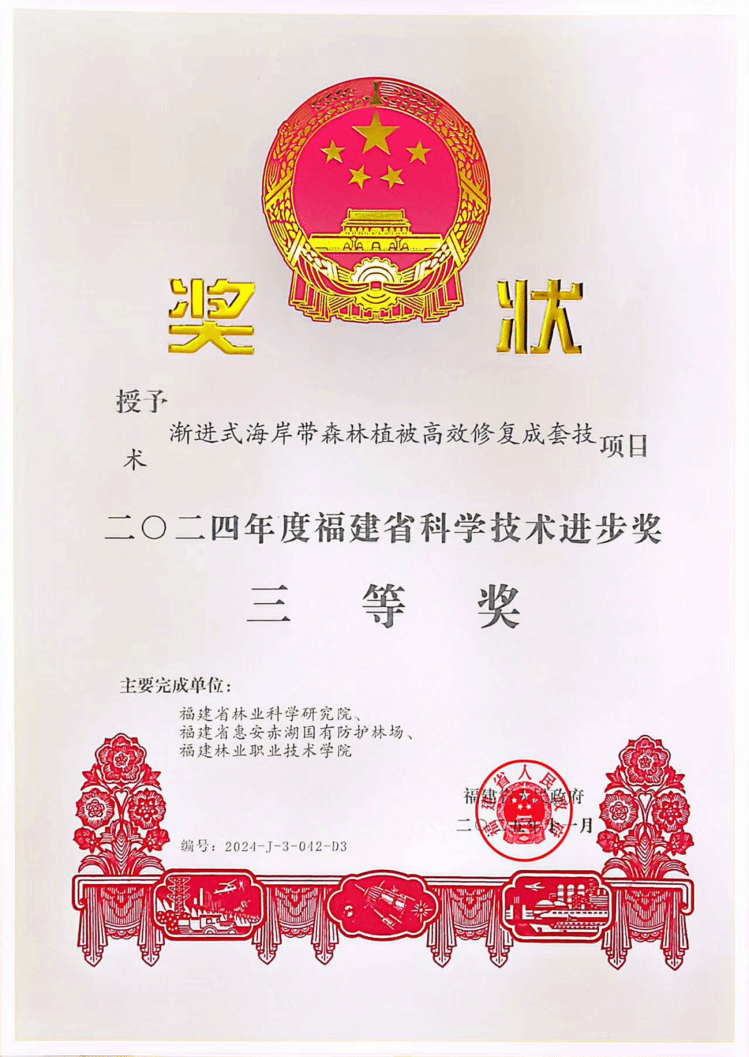本网讯 近日,我院高伟老师参与的《渐进式海岸带森林植被高效修复成套技术》项目,荣获2024年度福建省科技进步三等奖。这是高伟老师继2022年以来第2次荣获福建省科技进步奖,体现了我院在林业特色科研领域的持续积累与进步。