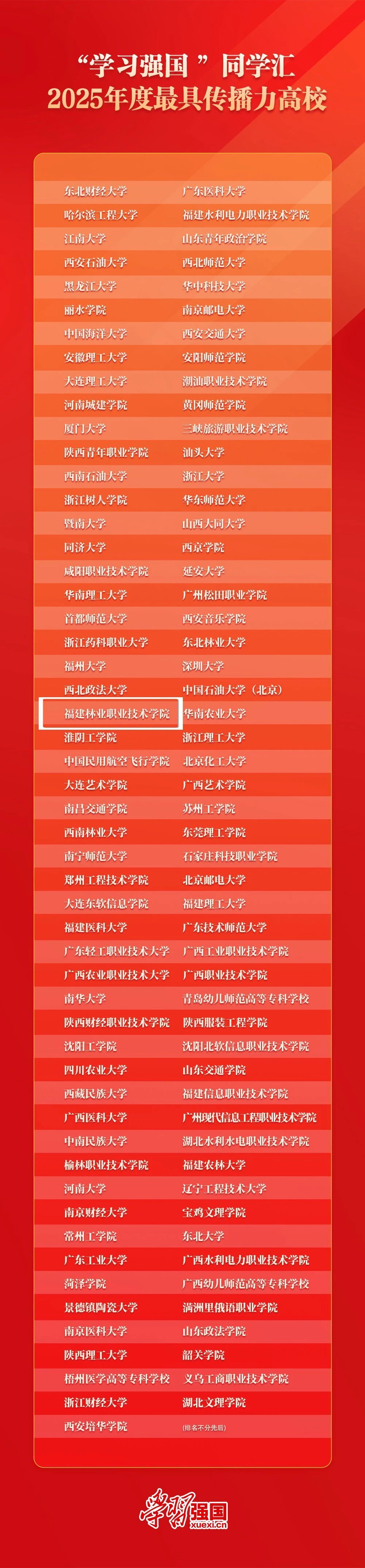 本网讯 近日,“学习强国”同学汇2025年度评选结果揭晓,福建林业职业技术学院获评“学习强国”同学汇“年度最具传播力高校”。