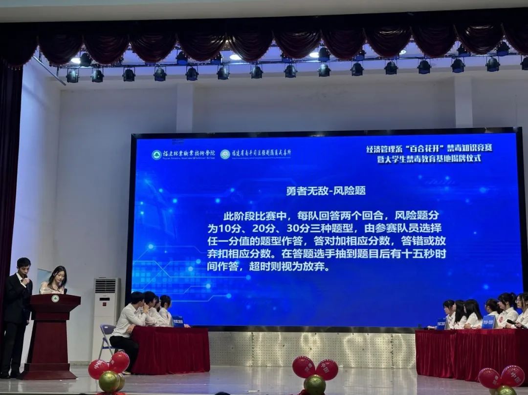 本网讯 为加深广大师生对禁毒知识的了解,强化识毒、防毒、拒毒能力,提升禁毒意识,创新禁毒宣传形式,营造良好禁毒宣传氛围,助力建设“绿色无毒校园”,2024年6月13日晚,学院经济管理系党总支与福建省南平司法强制隔离戒毒所,在天麟校区礼堂联合开展以“‘百合花开’禁毒赛‘绿色守’好青年”为主题的禁毒知识竞赛暨大学生禁毒教育基地揭牌仪式。院党委委员、副院长黄晖,南平司法强制隔离戒毒所党委委员、副所长、三级高级警长陈国顺,院安全保卫处处长胡宗焕,南平司法强制隔离戒毒所教育科科长陈永旺、管理科科长林海、回归指导大队政治教导员余建清,延平区禁毒大队教导员曾华建,南平市中级人民法院陈立伟,学院经济管理系主任林文胜、党总支副书记(主持工作)王昉、师生代表共计400余人参加本次活动。