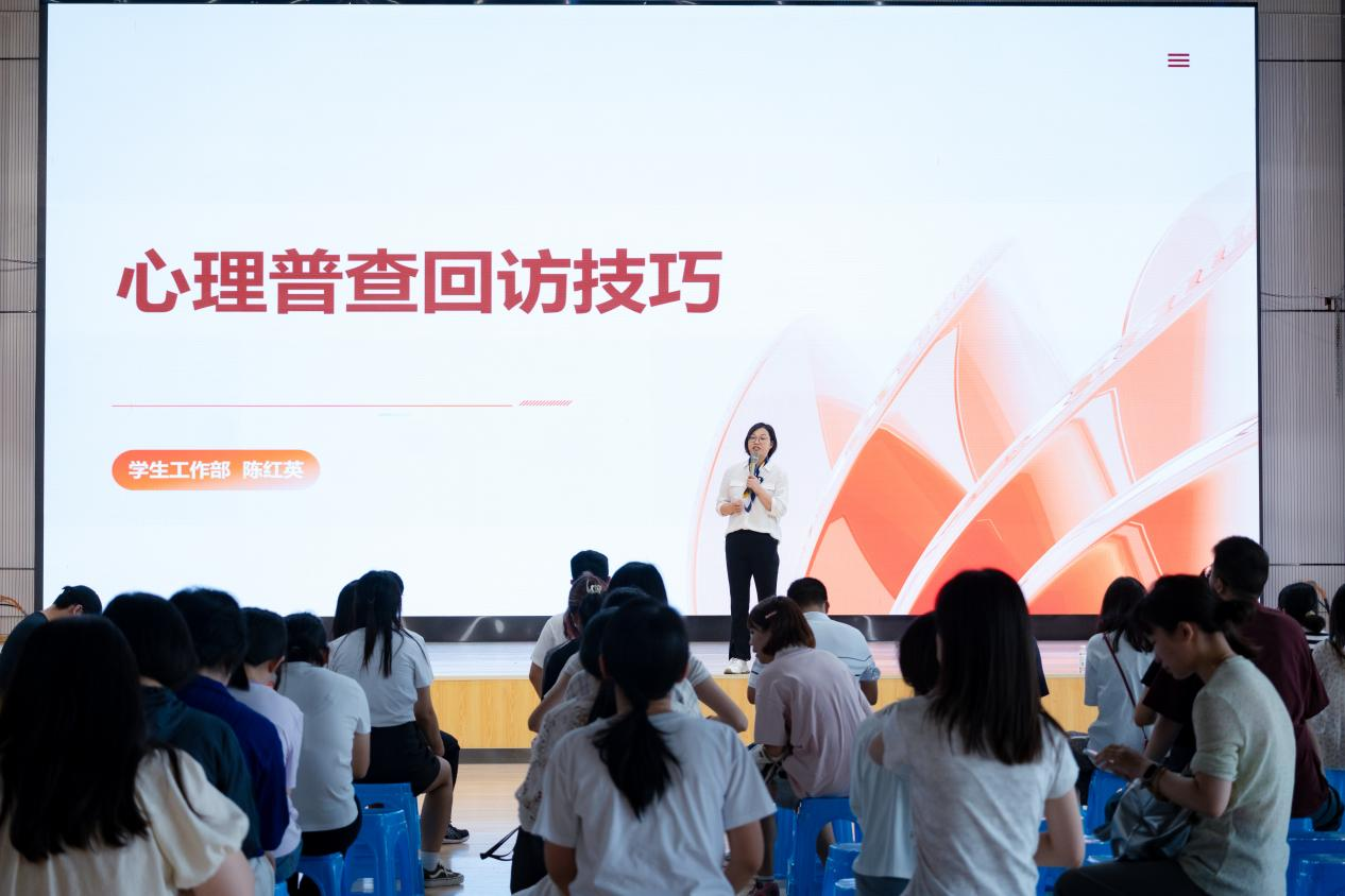 最后,陈红英为全体辅导员作心理健康讲座。她从学生心理普查工作的迫切性和必要性出发,分别讲解了心理普查的目的和意义、心理普查的内容和方式以及辅导员应如何开展工作,详细介绍了学生登录易班心理系统反馈的方式和流程,并分享了在以往的心理普查过程中存在的问题以及解决方法。本次培训有助于提升对心理危机的识别能力、干预能力和应对能力,做到心理问题早预防、早发现、早治疗,进一步强化心理育人成效,为呵护学生健康成长、建设平安校园保驾护航。