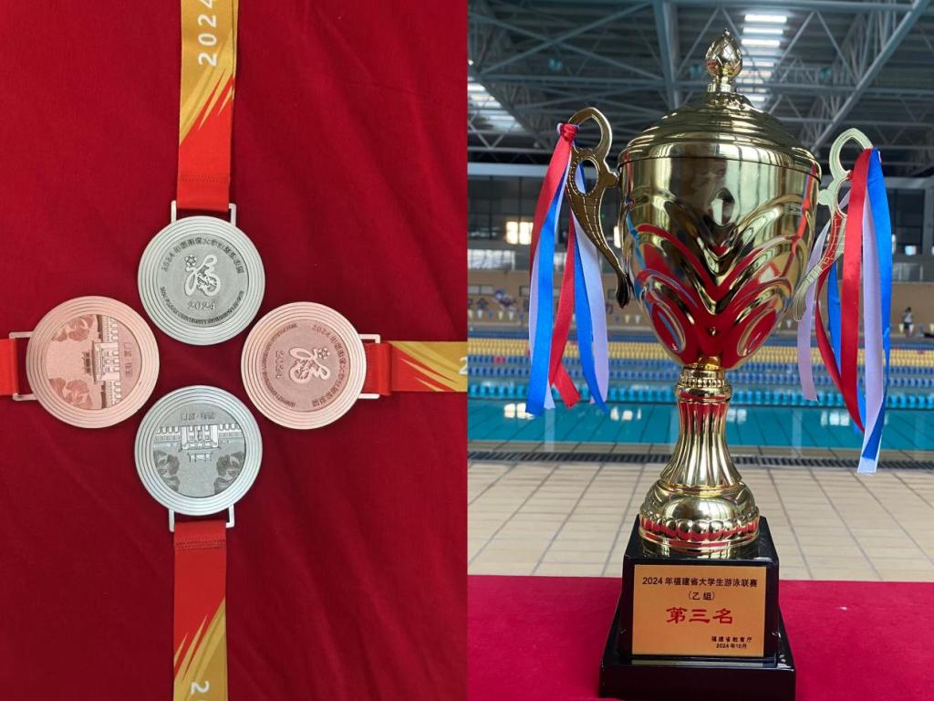 本网讯 2024年10月19-20日,由福建省教育厅主办,厦门大学承办的2024年大学生游泳联赛在厦门大学翔安校区游泳馆举办。近40支本科和高职院校队伍参赛,参赛运动员中不乏健将级水平的退役运动员。在师生的共同努力下,我院代表队在本次联赛中获得2个第二名(银牌)、2个第三名(铜牌)、3个第四名、1个第五名、2个第六名的好成绩,团体总分位列第三名。