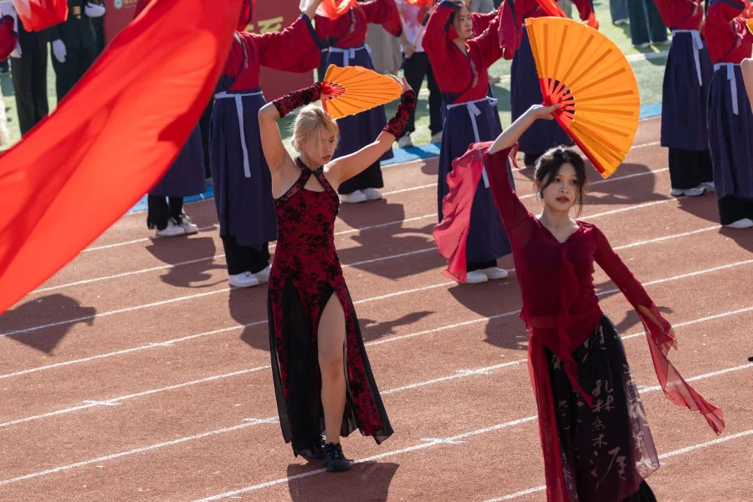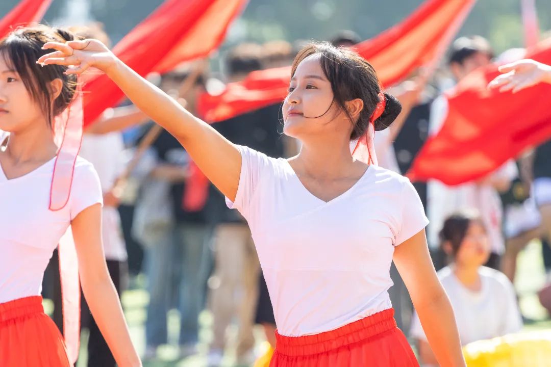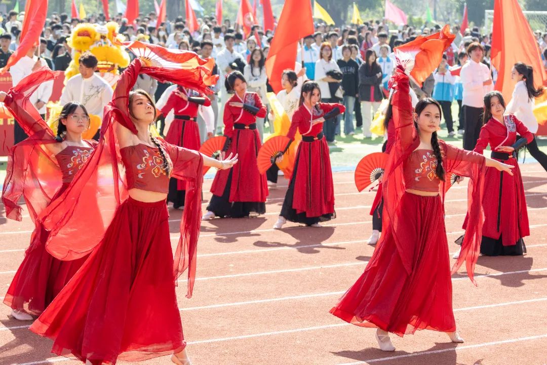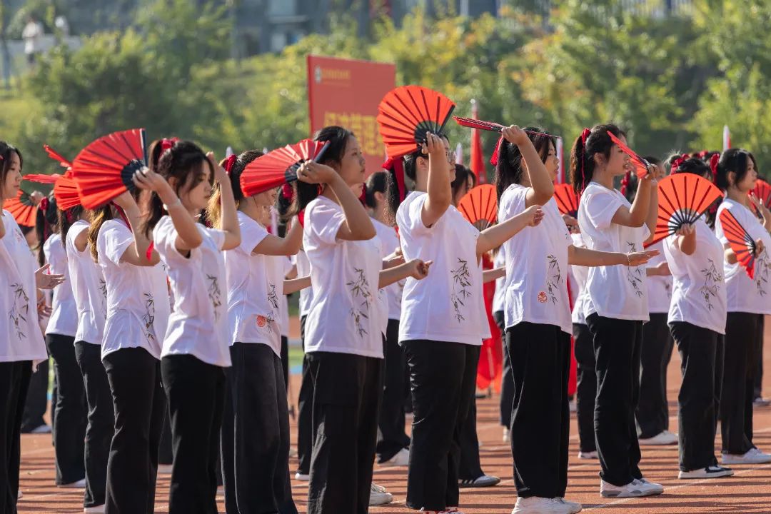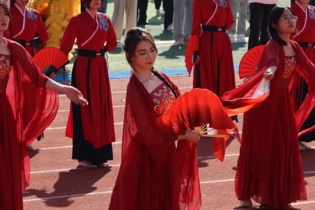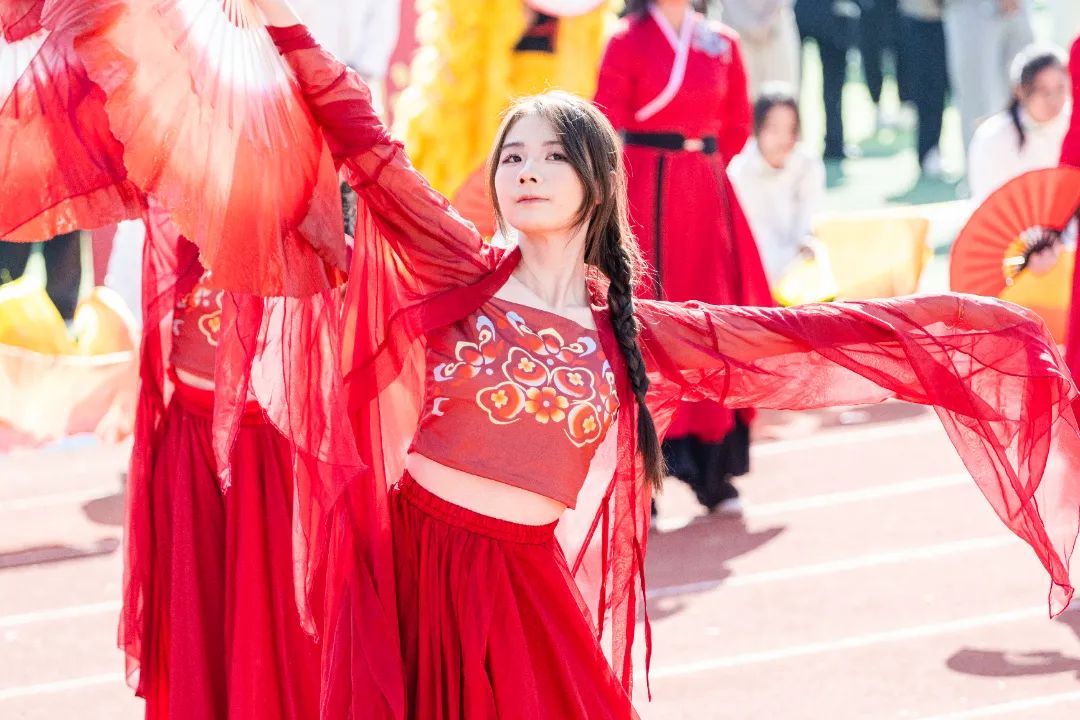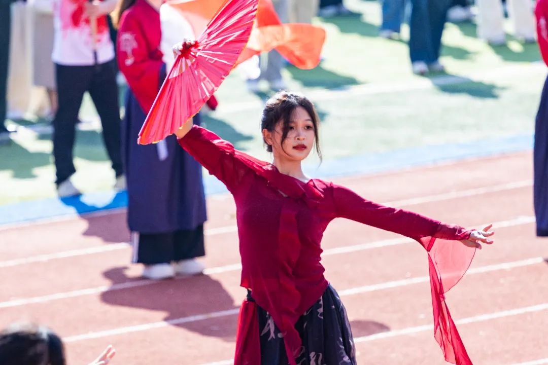 鲜艳红旗迎风飘扬,园林学子的身影轻盈跃动,舞扇轻展起舞翩翩,舞枪弄棒寒光乍现,转瞬之间都蕴含着东方美学的极致韵味。