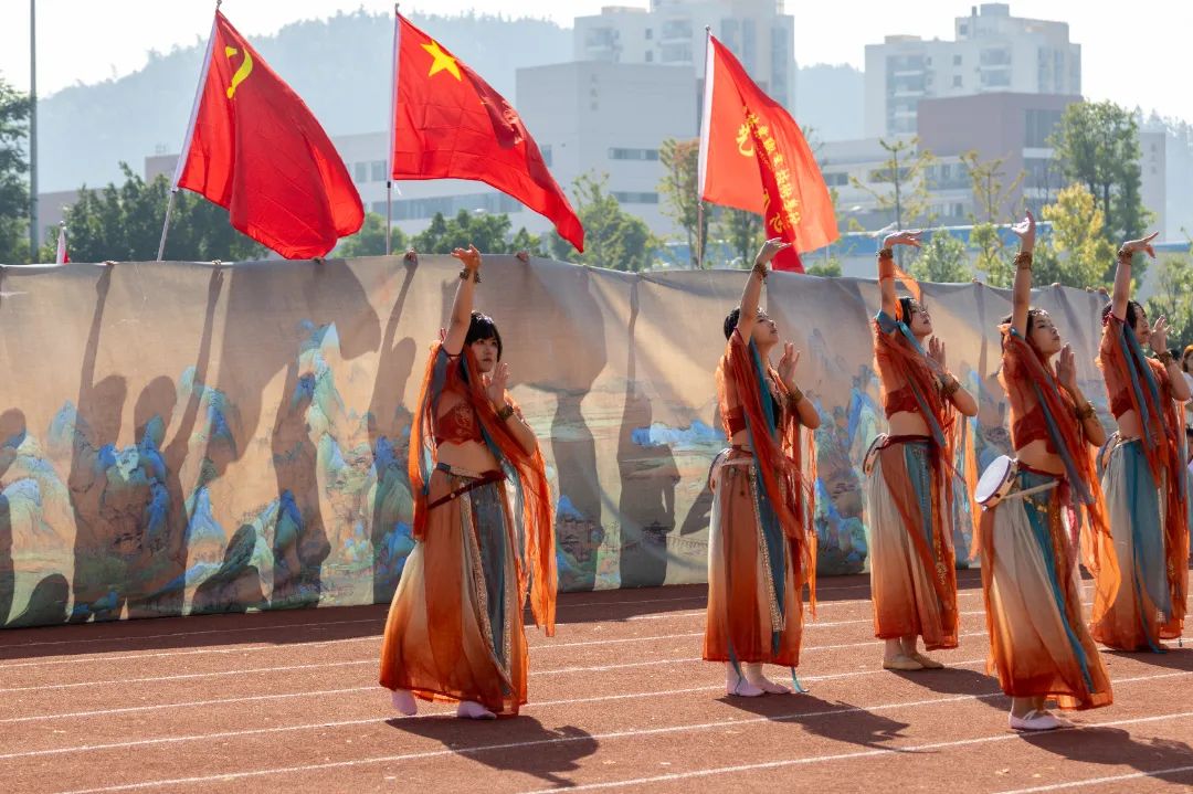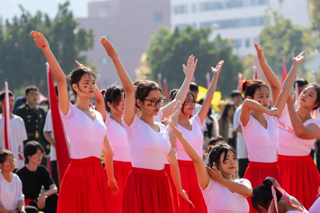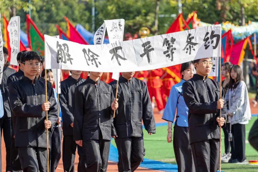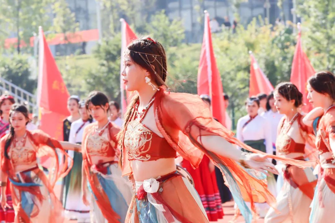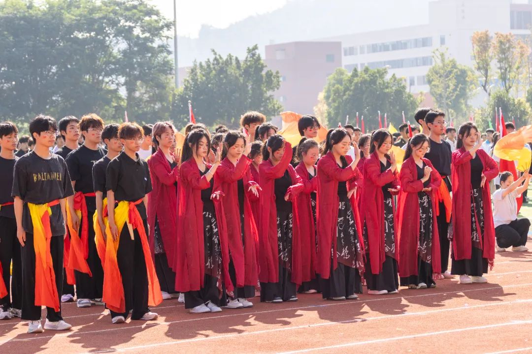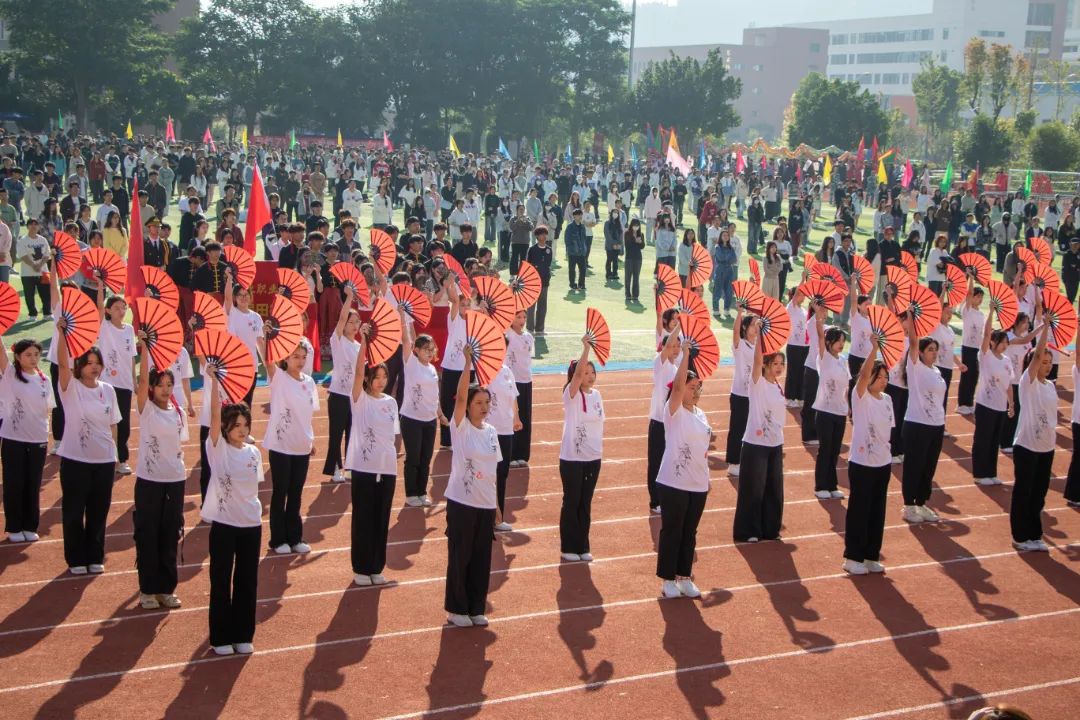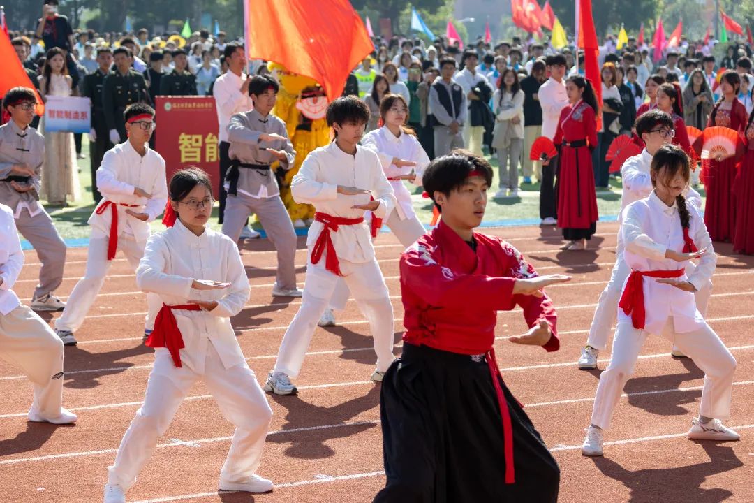 鲜艳红旗迎风飘扬,园林学子的身影轻盈跃动,舞扇轻展起舞翩翩,舞枪弄棒寒光乍现,转瞬之间都蕴含着东方美学的极致韵味。