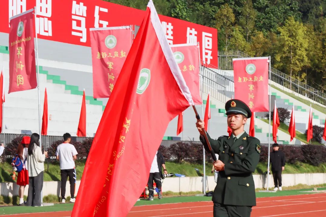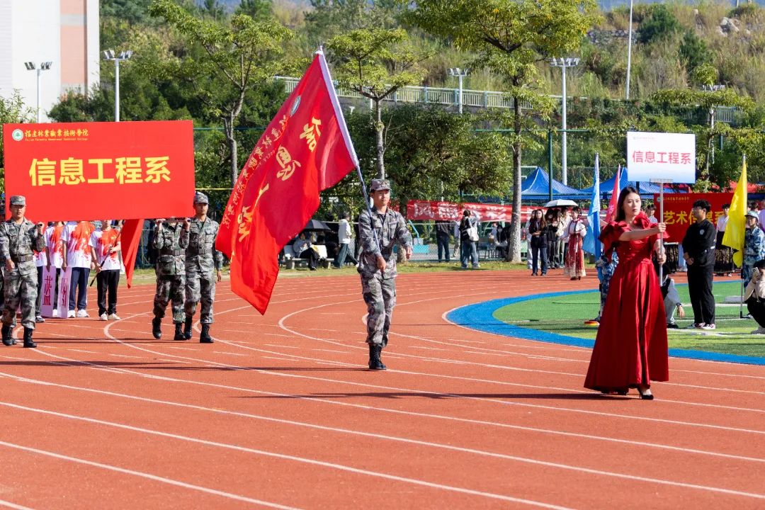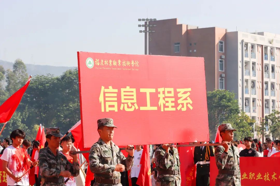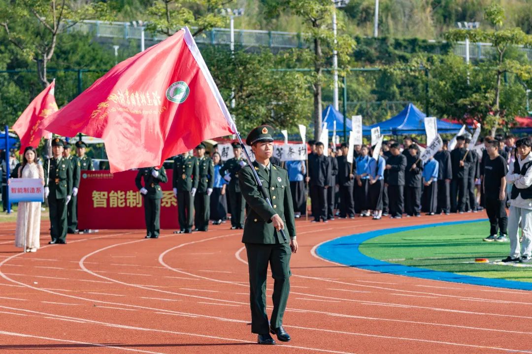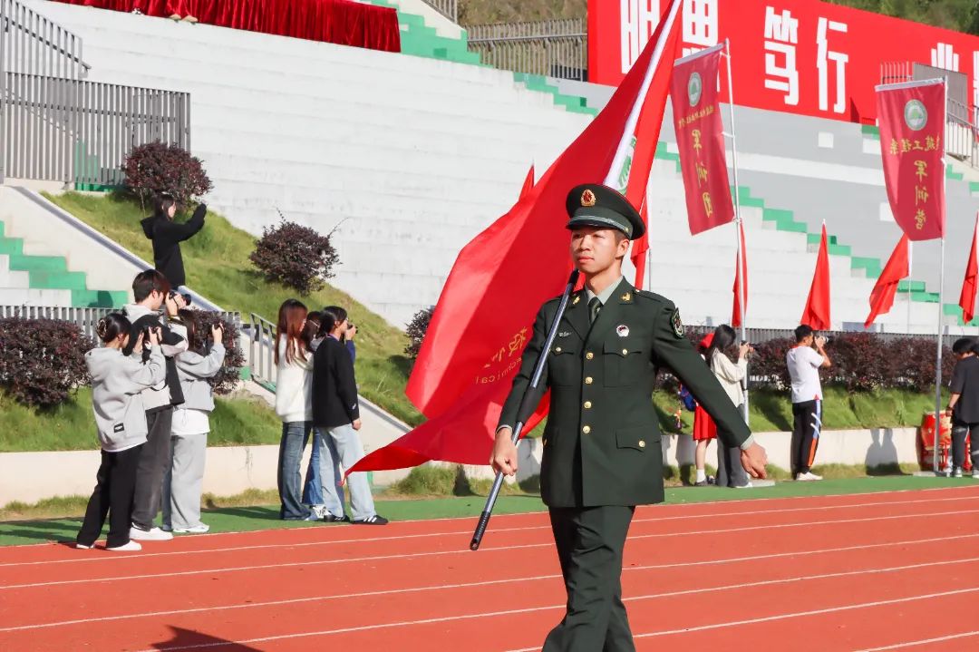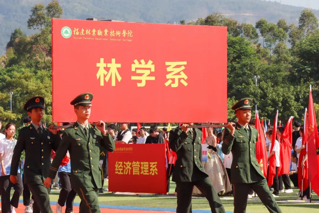 激昂的乐曲奏响,全体师生满心憧憬,翘首以盼,静待各方阵的精彩亮相。伴随着雄壮的《运动员进行曲》,由我院退伍军人组成的军鹰协会成员擎着庄严的五星红旗步入田径场,他们着装整齐,目光如炬;迈着铿锵有力的步伐,青春的风采与五星红旗交相辉映。承载天麟精神与林职校训的校旗和第35届运动会会标在万众瞩目之下缓缓入场,展天麟之精神,扬林职之风采。 八十面彩旗旗迎风飘扬,活力四射,青春洋溢。林职院的青春色彩肆意挥洒,全场氛围推向高潮,激情澎湃的运动会拉开序幕。