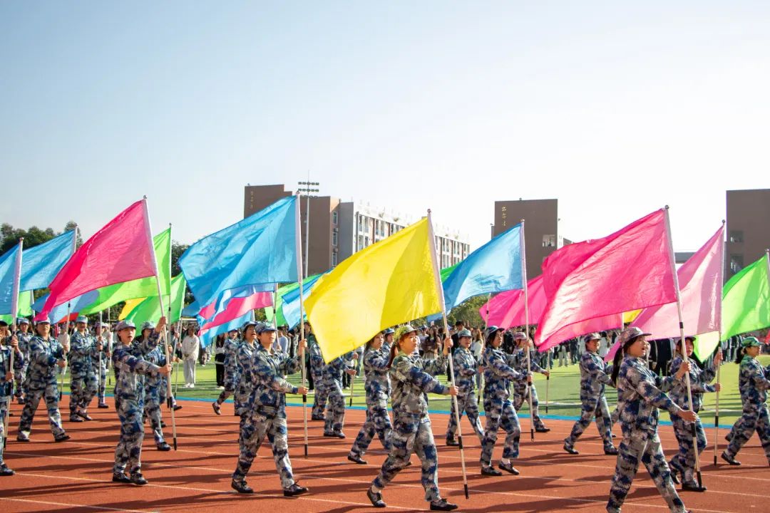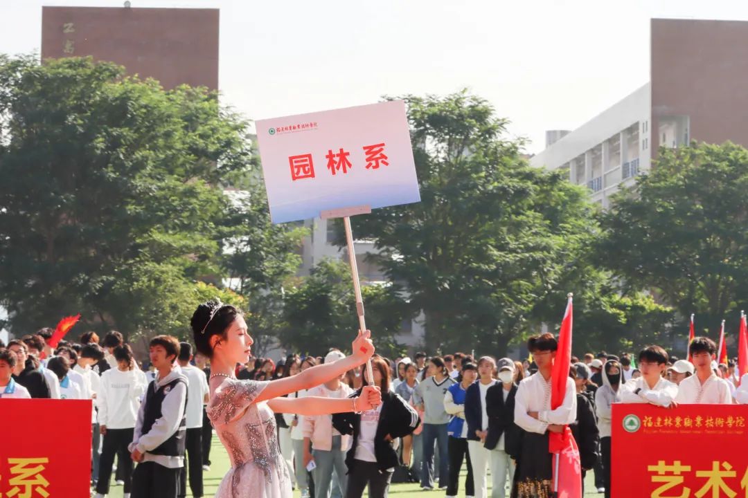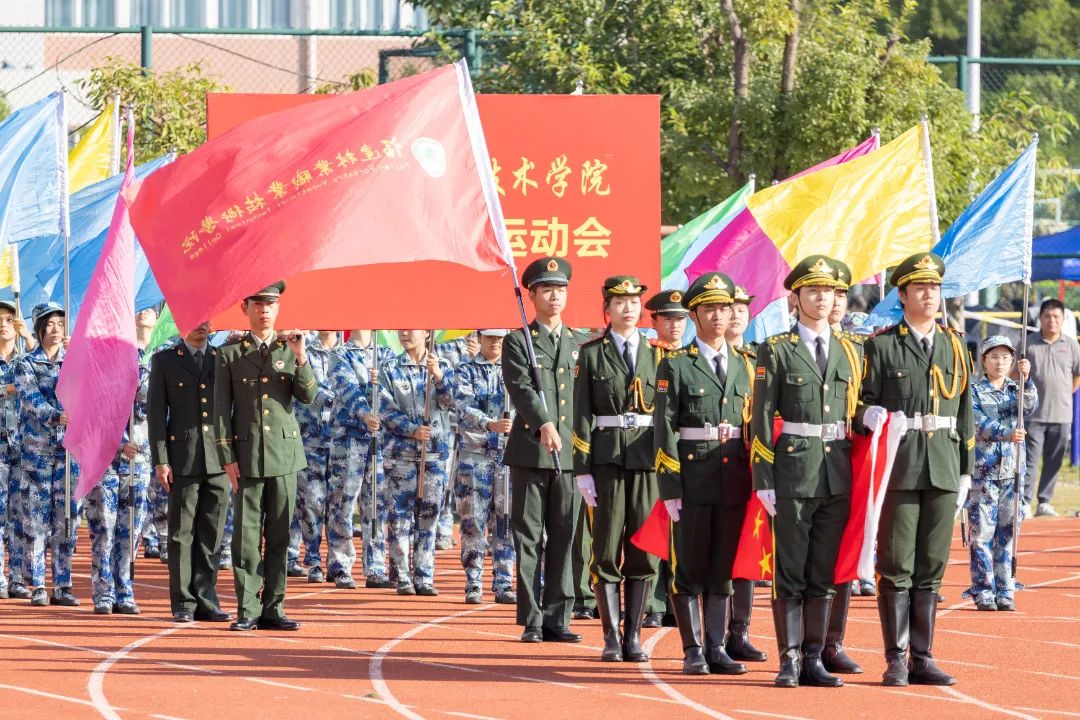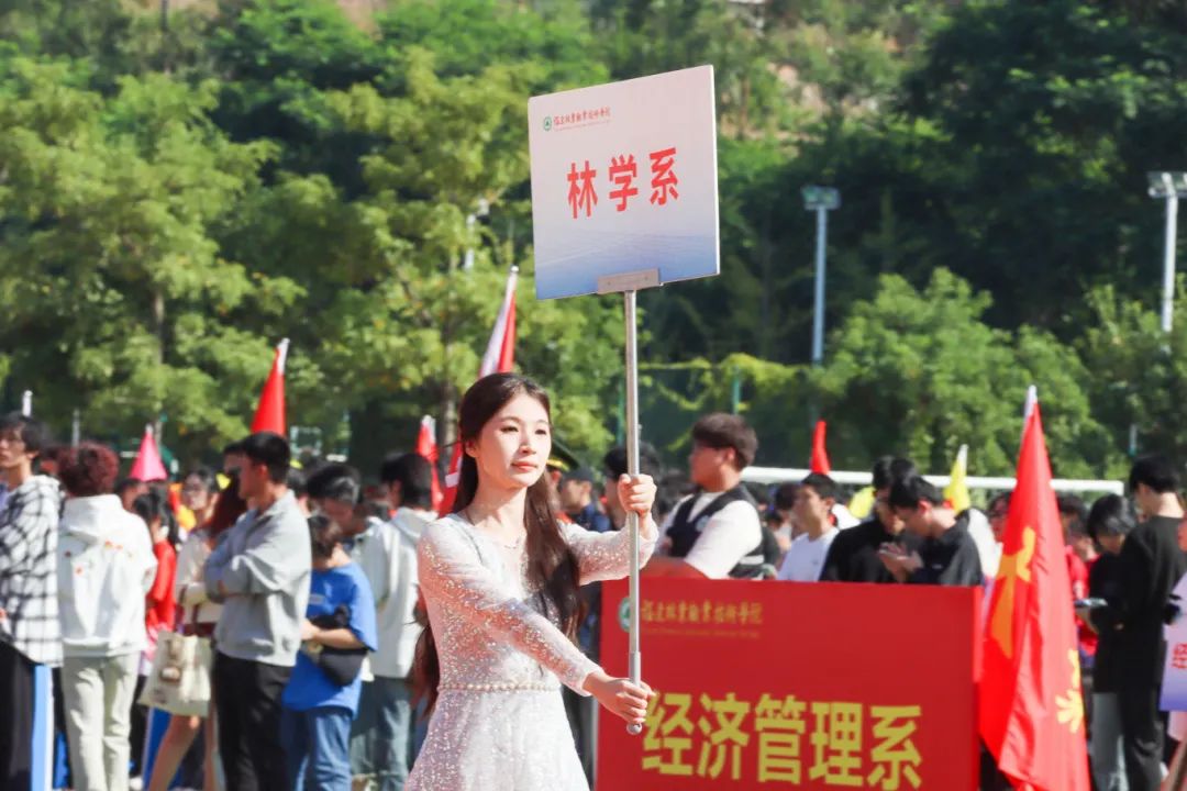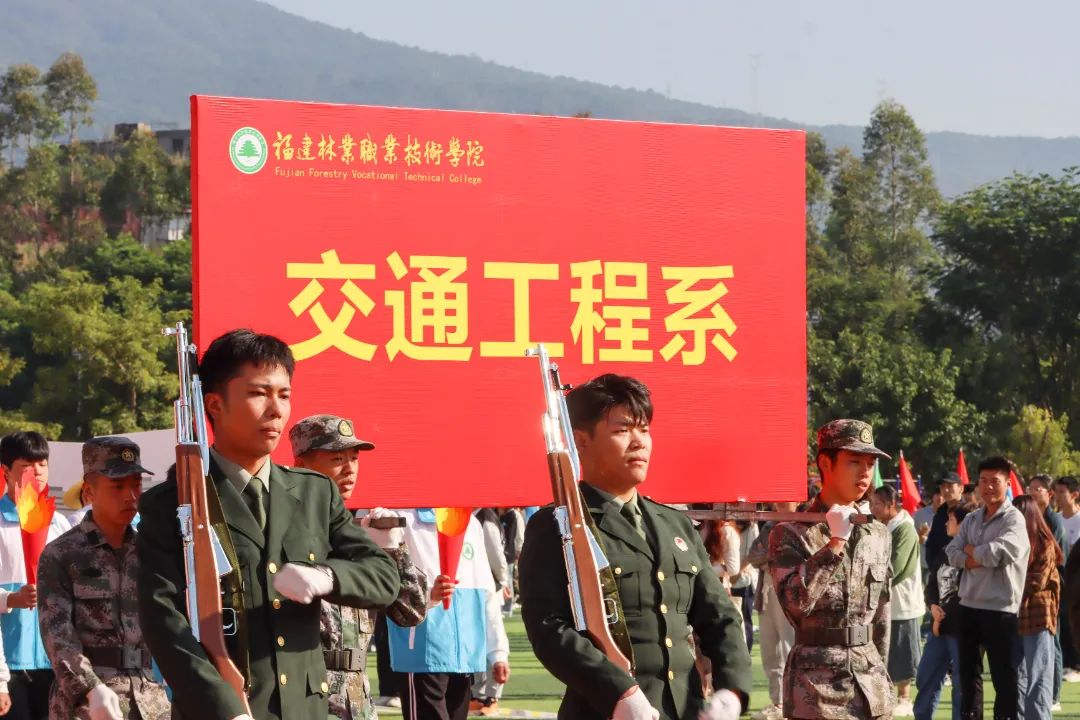 激昂的乐曲奏响,全体师生满心憧憬,翘首以盼,静待各方阵的精彩亮相。伴随着雄壮的《运动员进行曲》,由我院退伍军人组成的军鹰协会成员擎着庄严的五星红旗步入田径场,他们着装整齐,目光如炬;迈着铿锵有力的步伐,青春的风采与五星红旗交相辉映。承载天麟精神与林职校训的校旗和第35届运动会会标在万众瞩目之下缓缓入场,展天麟之精神,扬林职之风采。 八十面彩旗旗迎风飘扬,活力四射,青春洋溢。林职院的青春色彩肆意挥洒,全场氛围推向高潮,激情澎湃的运动会拉开序幕。