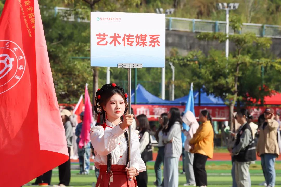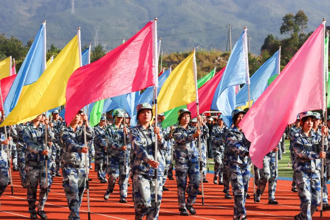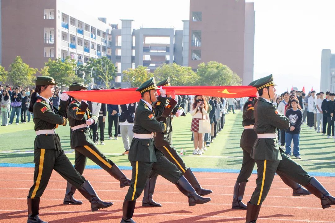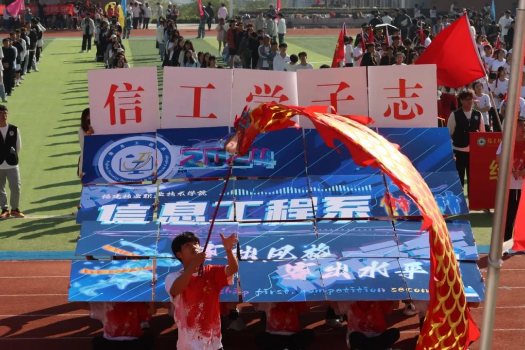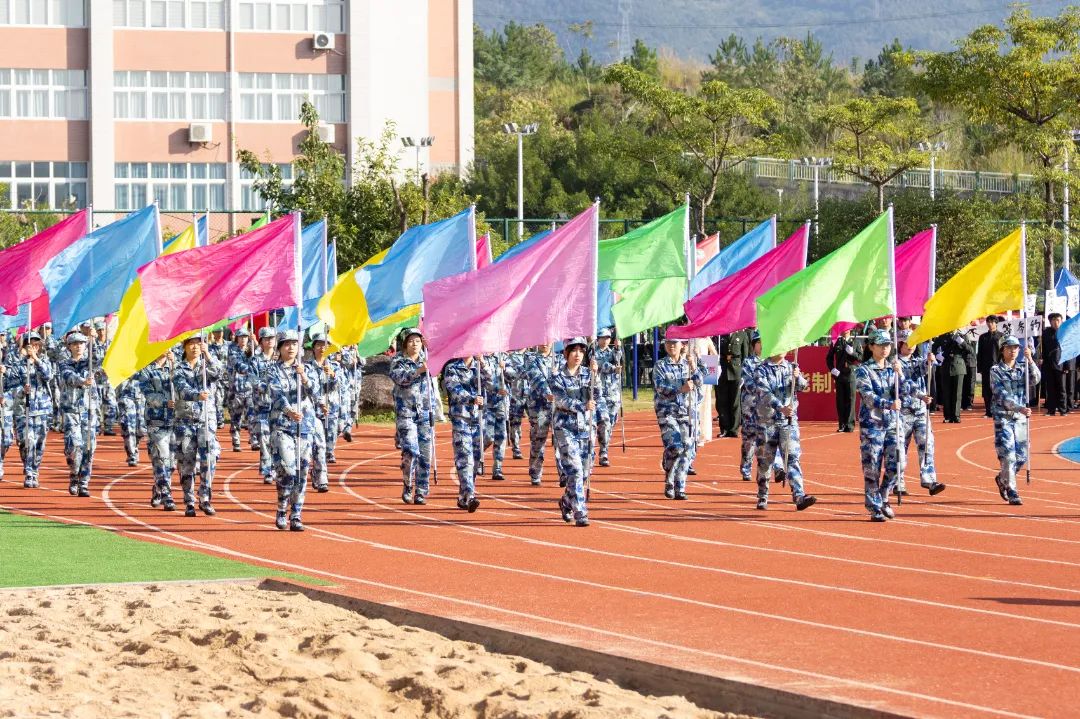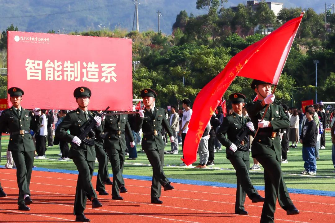 激昂的乐曲奏响,全体师生满心憧憬,翘首以盼,静待各方阵的精彩亮相。伴随着雄壮的《运动员进行曲》,由我院退伍军人组成的军鹰协会成员擎着庄严的五星红旗步入田径场,他们着装整齐,目光如炬;迈着铿锵有力的步伐,青春的风采与五星红旗交相辉映。承载天麟精神与林职校训的校旗和第35届运动会会标在万众瞩目之下缓缓入场,展天麟之精神,扬林职之风采。 八十面彩旗旗迎风飘扬,活力四射,青春洋溢。林职院的青春色彩肆意挥洒,全场氛围推向高潮,激情澎湃的运动会拉开序幕。