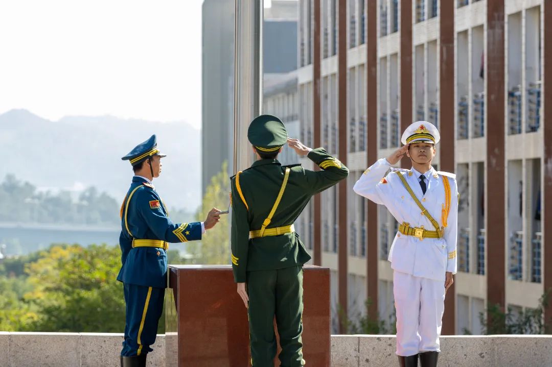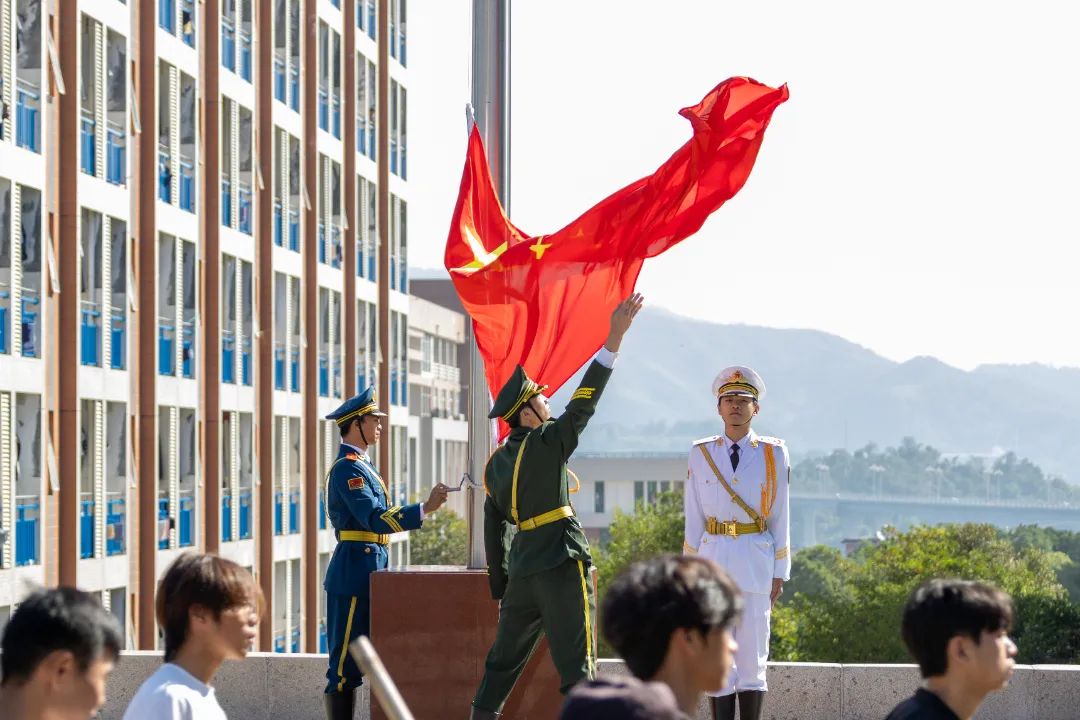 在激昂嘹亮的国歌声中,鲜艳的五星红旗冉冉升起。全体师生面向国旗,肃立致礼,齐唱国歌。
