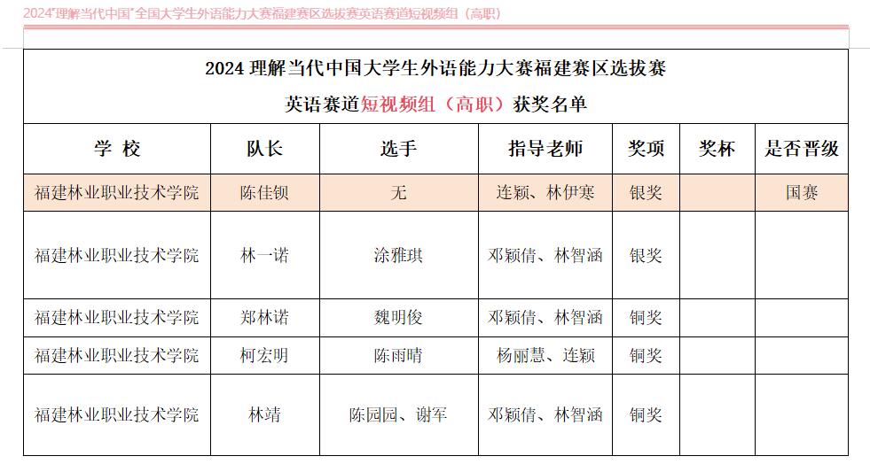 近日,由福建省人民政府新闻办公室、福建省教育厅、福建省国际传播中心指导,福建省人民政府外事办公室、外语教学与研究出版社主办,福建师范大学与华侨大学共同承办的2024“外研社∙国才杯”“理解当代中国”全国大学生外语能力大赛英语赛道短视频组福建赛区决赛在华侨大学落下帷幕。我院获得银奖2项,铜奖3项。