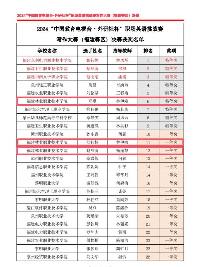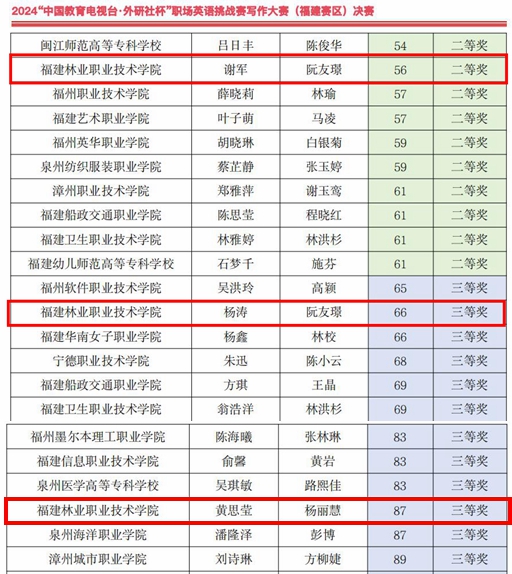 近日,2024“中国教育电视台·外研社杯”职场英语挑战赛写作大赛福建赛区决赛顺利举办。全省共有来自38所高职院校的183名选手参赛。我院学子在本次比赛中荣获特等奖1项、一等奖2项、二等奖1项、三等奖2项。