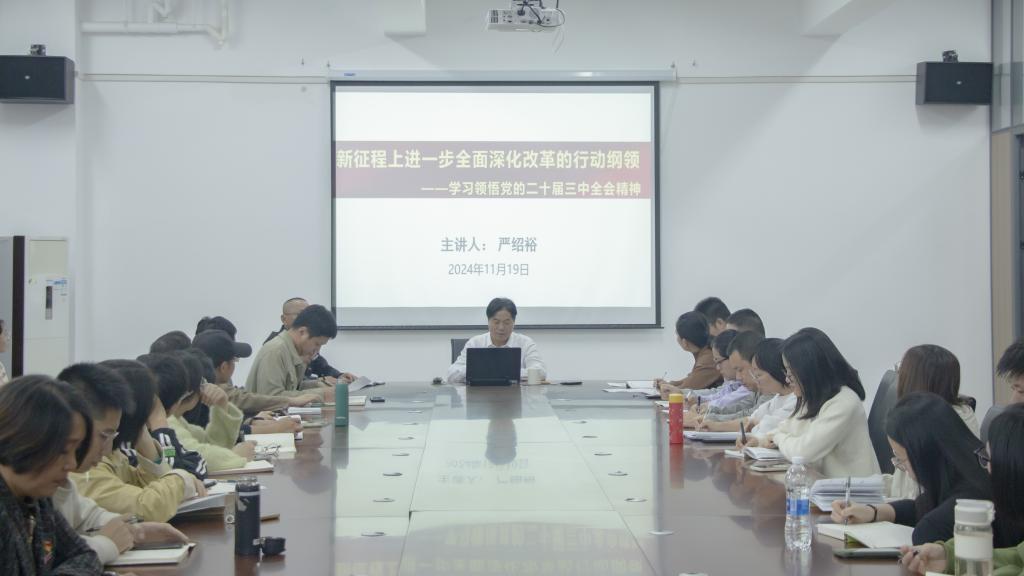 本网讯 为进一步扩大党的二十届三中全会精神学习覆盖面,增强学习实效性,11月19日,院党委副书记严绍裕在交通工程系会议室宣讲党的二十届三中全会精神。交通工程系全体师生党员参加学习,交通工程系党总支书记、主任孙华主持宣讲会。