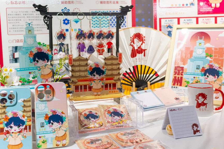 “阿妹”是泉州簪花非遗形象IP设计,以泉州簪花文化与传统云肩汉服为主题旨在展现泉州独特的地域风情和深厚的历史文化底蕴。身着华丽的云肩汉服,云肩的设计精美,绣有海浪图案,与泉州相互呼应,增添了整体的美感。