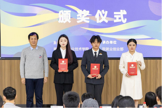 就业创业指导科科长黄庆斌为铜奖项目获奖者颁奖
