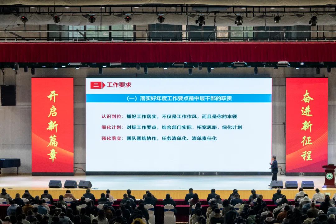 学院党委副书记、院长刘文开以《聚焦教育强国建设 推动学院高质量发展》为题,从“强化理论武装,坚持和加强党的全面领导;夯实组织基础,推进党建工作提质增效;聚焦立德树人,构建大思政育人新格局;加强统筹协调,全力做好招生就业工作;突出项目引领,持续提升办学综合实力;深化产教融合,高效赋能经济社会发展;提升师资素质,打造教育教学创新团队;优化育人模式,促进学生健康成长成才”等八个方面对学院2025年工作进行了安排部署。