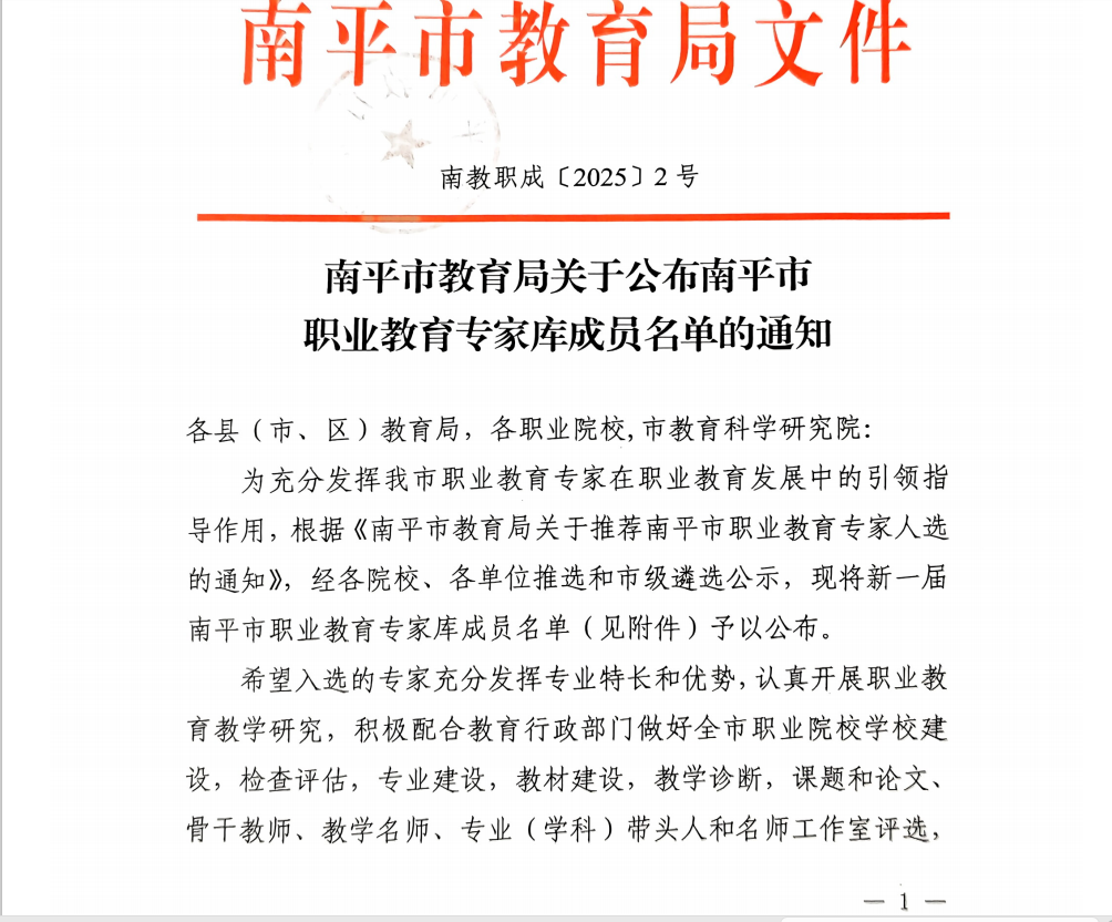 本网讯 为充分发挥南平市职业教育专家在职业教育发展中的引领指导作用,南平市决定从职业院校从事专业教学或职业教育研究的人员、中等职业学校专业(学科)带头人或骨干教师、职业教育教研机构专业技术人员中遴选专家组建南平市职业教育专家库,参与全市职业院校学校建设、检查评估、专业建设、教材建设、教学诊断,课题和论文、骨干教师、教学名师、专业(学科)带头人及名师工作室评选、职业院校技能大赛评判等工作。南平市域高职院校有83位专家入选,我院共有46位教师入选。入选的专家将充分发挥专业特长和优势,认真开展职业教育教学研究,积极配合教育行政部门做好各项工作,为南平市职业教育高质量发展做出贡献。