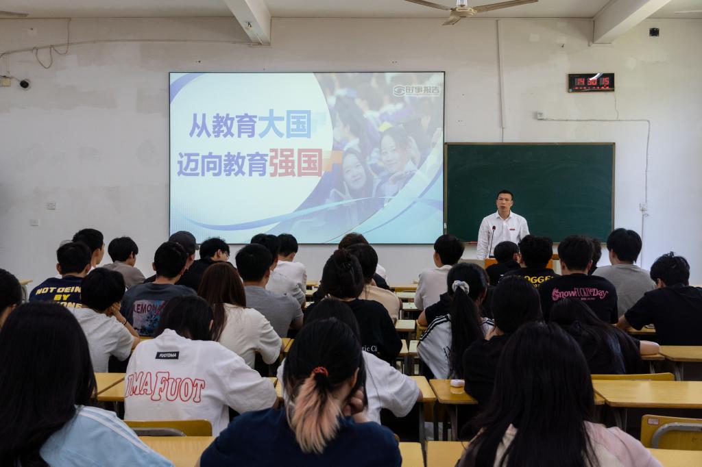 詹其仙书记以5月12日中美关税政策调整这一国际经贸热点为开篇,通过剖析关税博弈背后的科技竞争、产业升级等深层逻辑,鲜明指出:“国家在全球产业链中的竞争力,本质上是教育培养的人才竞争力。”他结合当前世界百年未有之大变局,强调教育作为强国建设的基础性、战略性支撑,直接关系到国家科技自立自强和民族复兴伟业。这一紧扣时事的导入,迅速拉近理论与现实的距离,让学生深刻体会到“教育强国”并非抽象概念,而是与国家命运、个人发展紧密相连的时代命题。