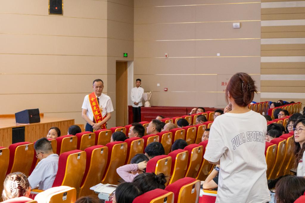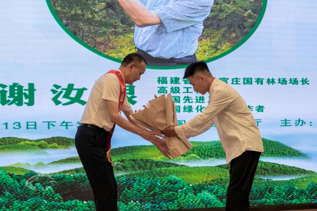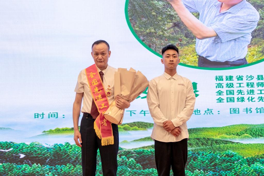 随后,谢汝根用平实的语言,深情回顾了自己扎根林业40余年从一名学徒工逐步成长为全国先进工作者的励志历程。“42年的林业生涯,从青葱少年到鬓染霜华,从学徒工做起,到技术员、到林场管理者,我始终与青山为伴、以绿树为友。这既是一段个人的成长历程,更是一段与林业改革发展同频共振的奋斗史。”从基层起步以技术筑基,以创新破局为林改探路,以示范引领促产业升级,以场带村助力乡村振兴,退岗不褪色余热映初心。他的故事深深打动了在场每一位师生,让大家真切体会到只要心怀热爱、勇于担当,都能在平凡中成就不凡。