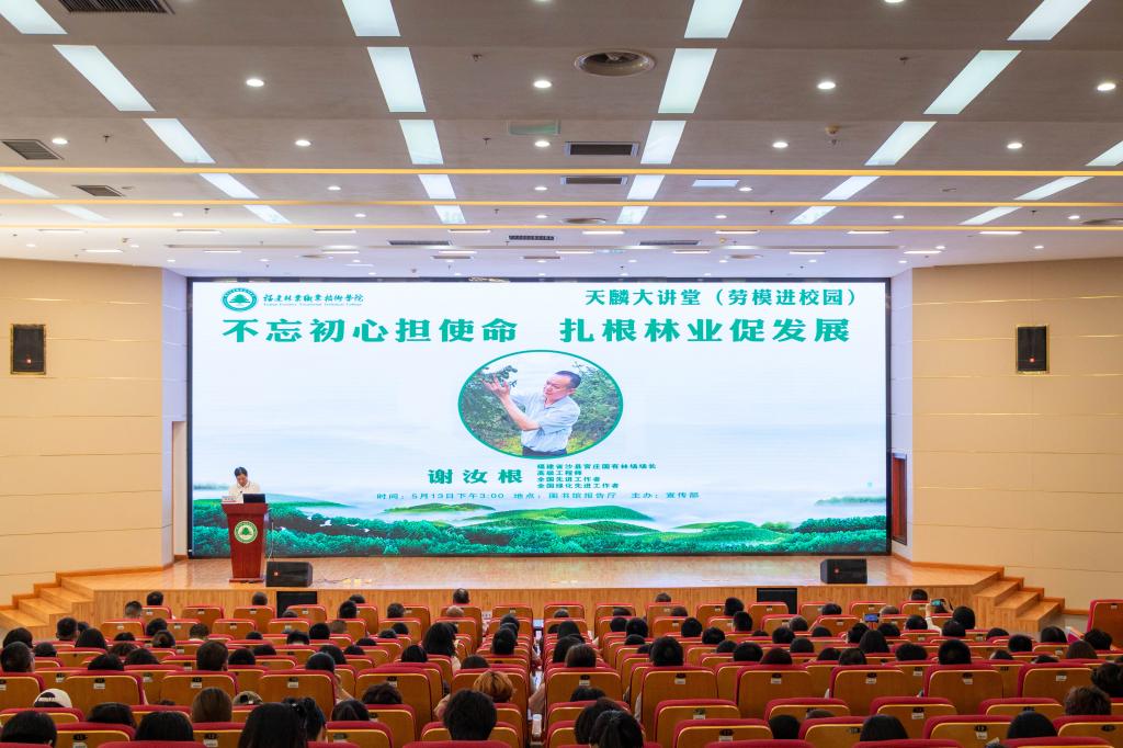 5月13日,学院江南校区图书馆报告厅内,我院师生与全国先进工作者、全国绿化先进工作者、福建省沙县官庄国有林场高级工程师、福建林校林业专业成人8701班校友谢汝根面对面,进行了一场劳模精神的深入交流。我院党务干部暨教工党支部书记“双带头人”培训班、年轻干部、新提拔干部培训班全体学员及学生代表共计500人齐聚一堂,共同现场聆听劳模的故事,感受榜样的力量。“劳模进校园”宣讲活动由院党委副书记严绍裕主持。