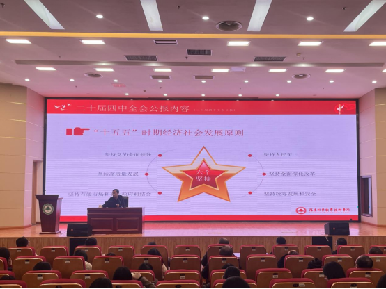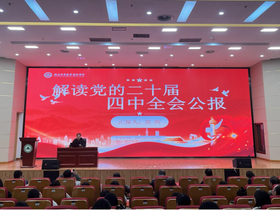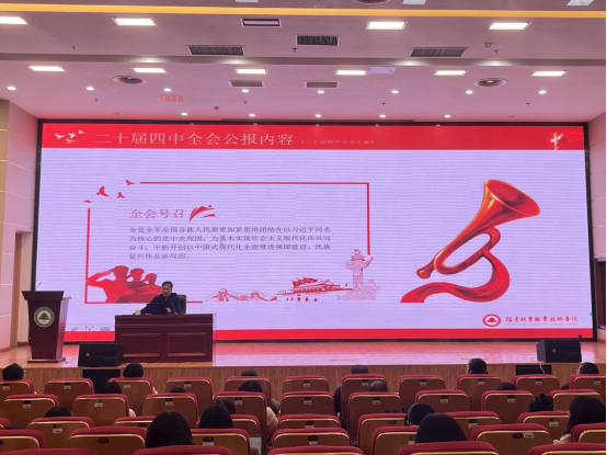本网讯 为深入学习党的二十届四中全会精神,引导广大教职工切实把思想和行动统一到党中央的决策部署上来,深刻把握其在党和国家事业发展进程中的里程碑意义,2025年11月27日下午,学院副院长黄晖在江南校区图书馆报告厅上《党的二十届四中全会公报》专题党课。经济管理系、继续教育学院、招生就业处、现代教育技术中心及教务处全体教职工党员参加学习。本场宣讲由经济管理系副书记张翼翔主持。