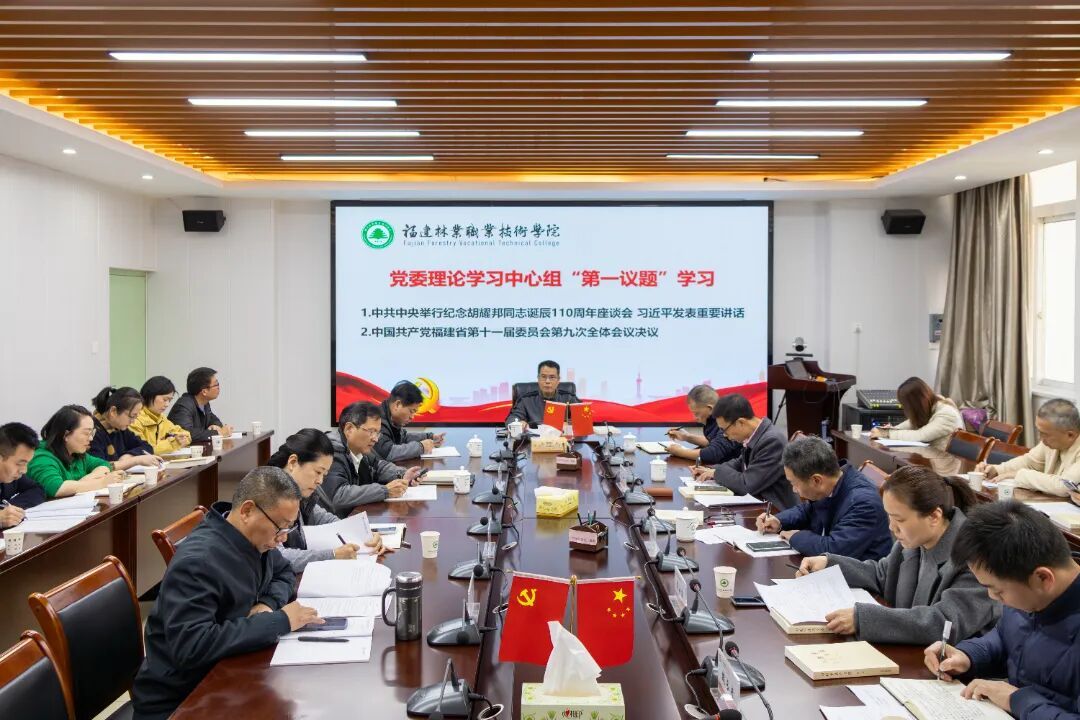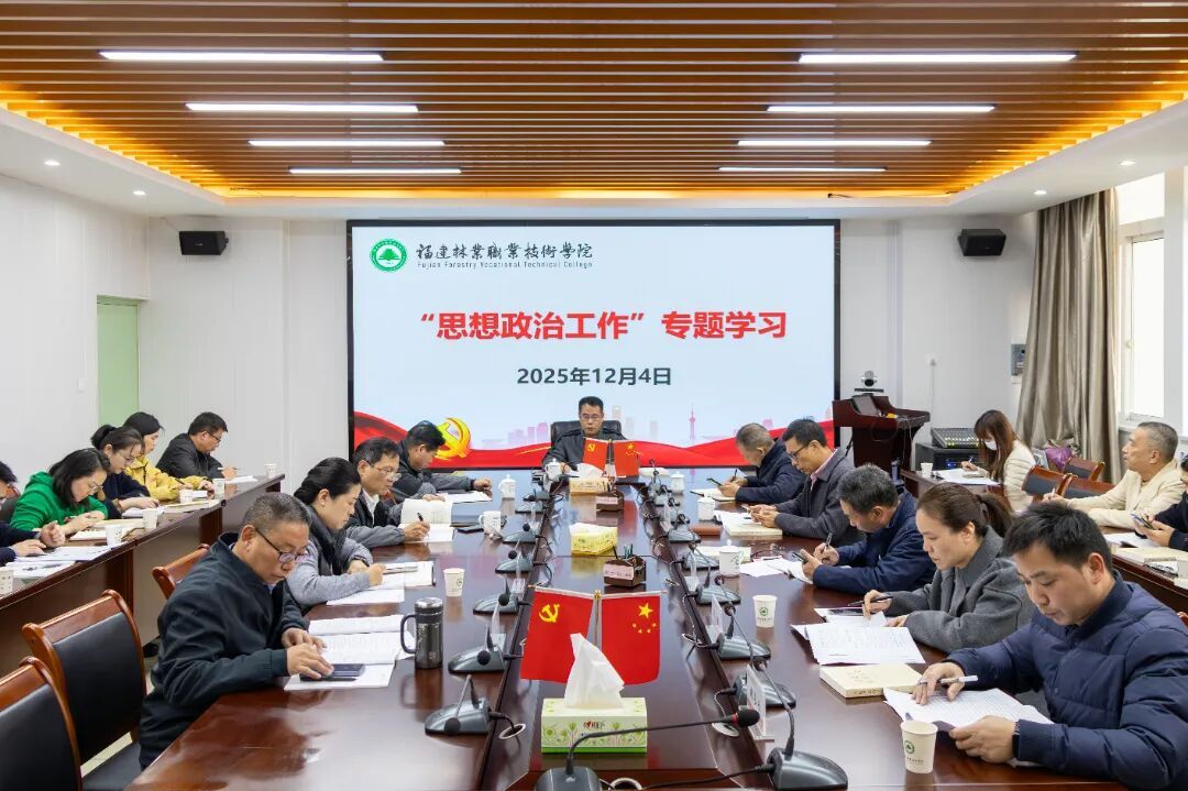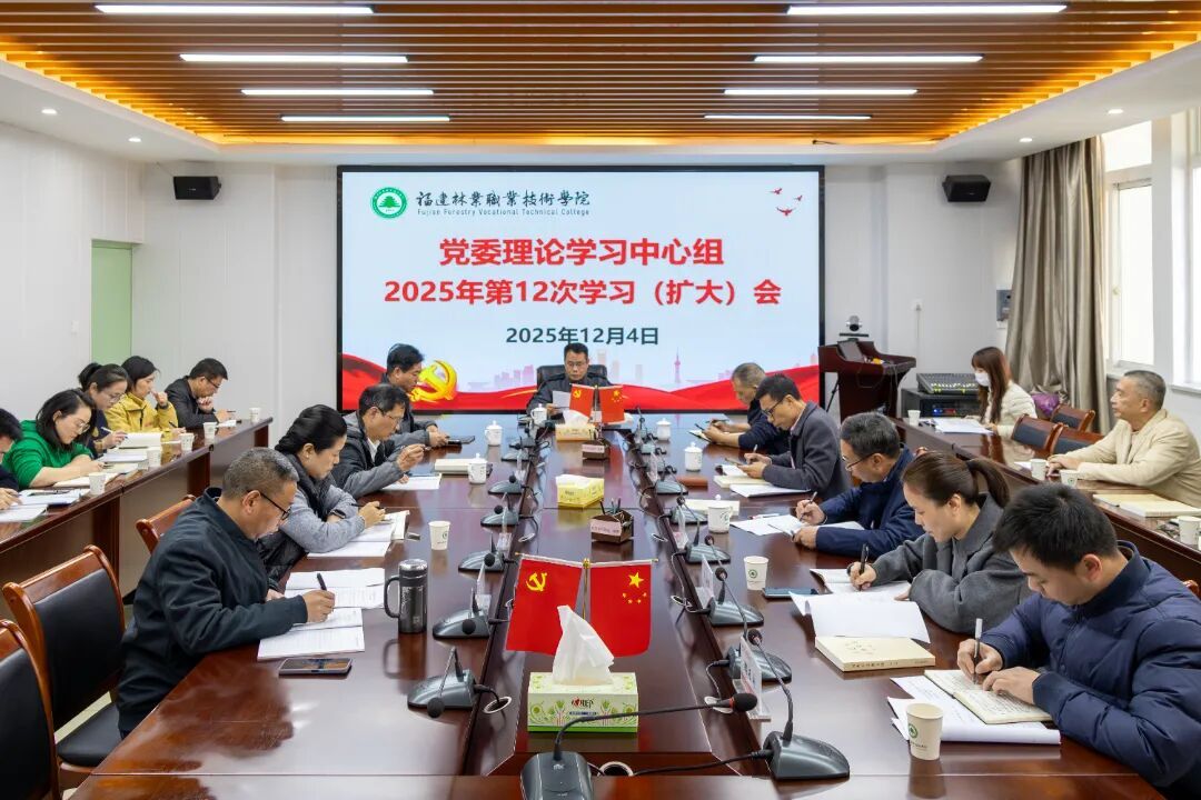 本网讯 12月4日下午,院党委书记陈建辉在江南校区行政楼五楼会议室主持召开2025年第12次党委理论学习中心组学习(扩大)会,会议开展党委理论学习中心组“第一议题”学习和“思想政治工作”“习近平法治思想”专题学习,党委理论学习中心组成员及各系党总支书记、机关处室党支部书记参加学习。