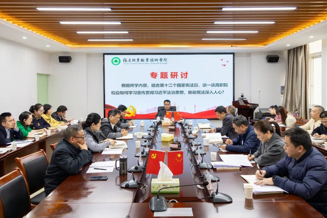 会议开展“习近平法治思想”专题学习,陈建辉书记传达学习贯彻中共中央宣传部、中央全面依法治国委员会办公室发出关于认真组织学习《习近平法治思想学习纲要(2025年版)》的通知,领学《习近平法治文选》第一卷《谱写新时代中国宪法实践新篇章》。党委委员、副院长李肇锋、党政办公室主任陈政、建筑工程系党总支书记魏长专根据所学内容,结合第十二个国家宪法日,就高职院校应如何学习宣传贯彻习近平法治思想,推动宪法深入人心交流发言,分享学习心得。