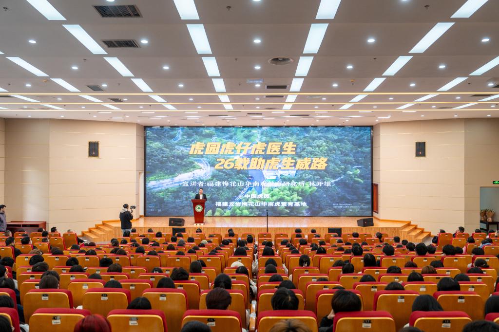 在劳模进校园暨“先进模范上讲台”大思政课中,福建梅花山华南虎繁育研究所所长林开雄带来题为《虎园虎仔虎医生 26 载助虎生威路》的宣讲。林开雄所长生动讲述了自己26年来,白手起家,扎根深山,克服艰苦条件,将梅花山华南虎繁育研究打造成了生物多样性保护的生态样板的动人事迹。他在华南虎保护事业上执着坚守,用青春书写壮丽华章,为保护这一珍稀物种贡献智慧与力量,展现了他爱岗敬业、不畏艰难、不懈探索的劳模精神。