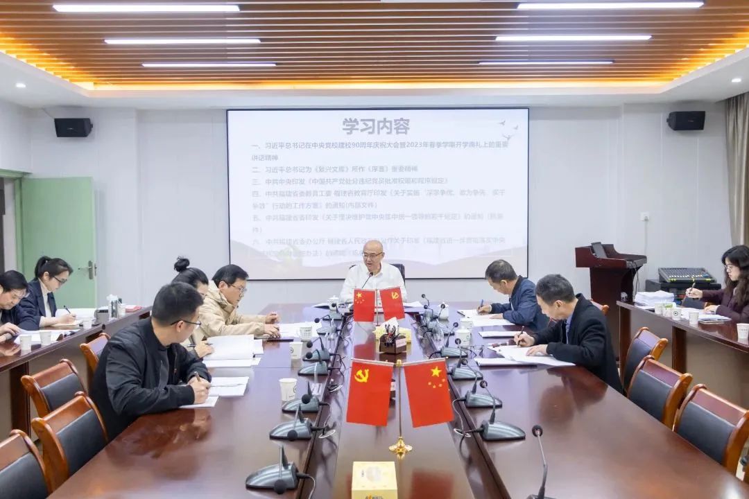 会议还集中学习了习近平总书记在中央党校建校90周年庆祝大会暨2023年春季学期开学典礼上的重要讲话精神、习近平总书记为《复兴文库》所作《序言》重要精神、中共中央印发《中国共产党处分违纪党员批准权限和程序规定》,中共福建省委教育工委 福建省教育厅印发《关于实施“深学争优、敢为争先、实干争效”行动的工作方案》的通知等内容。