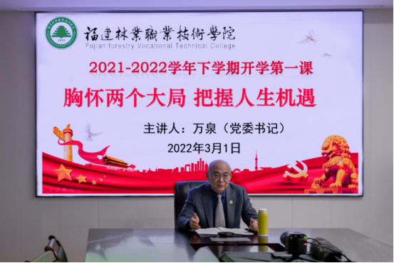 本网讯 “我们要深刻把握世界之变、时代之变、历史之变,胸怀两个大局,着眼职业教育发展形势和大学生就业形势,以青春之我、奋斗之我,书写时代华章。”3月1日下午,福建林业职业技术学院开学第一课在线上如约举行。院党委书记万泉以“胸怀两个大局 把握时代机遇”为题,和全院万名师生齐聚“云端”,一起探讨在两个大局之下,青年学生应如何准确把握职业教育发展形势和大学生就业形势,做好人生规划,一起向未来。