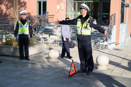 活动开始前,南平高速交警支队一大队的警官对交通安全设备进行了讲解,并现场模拟演示了在高速上发生两车碰撞交通事故时正确的处置方式,使同学们能直观地学习到正确的处置流程。