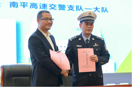 南平高速交警支队一大队大队长陈宗富与学院安全保卫处副处长杨峰代表双方签订共建协议,与会领导为我院“平安归来·高校”交通安全志愿宣讲员代表颁发荣誉证书。