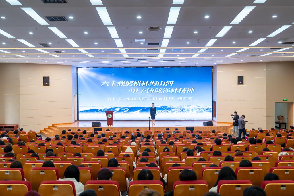 在福建林业先进事迹进校园暨“洋林精神上讲台”大思政课中,省洋口国有林场“洋林精神”宣讲员赖红英以《六十载躬耕林海山河 一甲子铸就洋林精神》为题,讲述了福建省洋口国有林场杉木育种科研团队六十年如一日,让洋林精神生生不息、薪火相传的事迹,深刻阐述了老一辈林业人坚守初心、赤诚奉献、久久为功、科研报国的“洋林精神”。