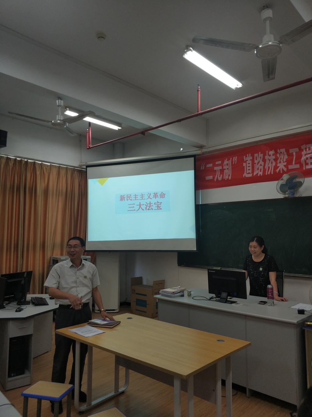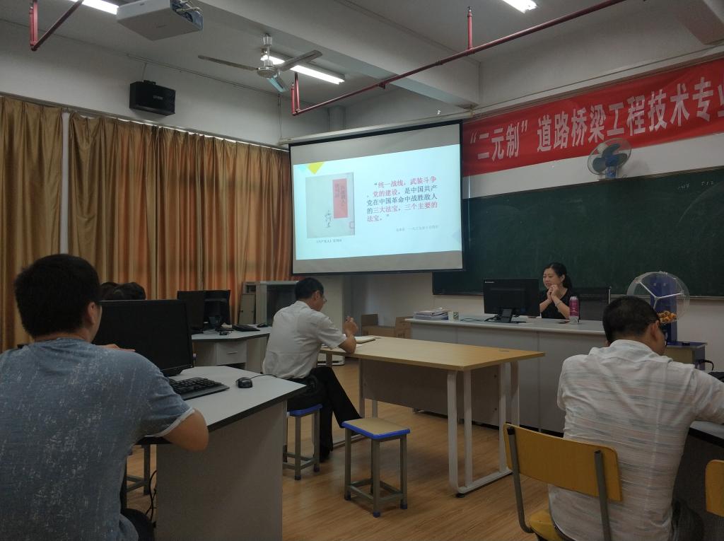 本网讯 为深入开展“不忘初心、牢记使命”主题教育专题活动,10月8日下午3点40,交通工程系党总支邀请思政部副主任杜彩银老师为交通工程系党总支全体党员上了一堂以《新民主主义革命三大法宝》为主题的党课。