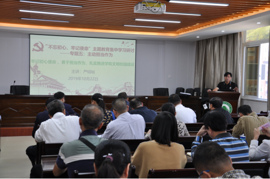 本网讯 10月22日下午,福建林业职业技术学院在江南校区办公楼六楼会议室开展“不忘初心、牢记使命”主题教育“主动担当作为”专题党课学习。学院副院长严绍裕上了题为“牢记初心使命、勇于担当作为,扎实推进学院文明校园建设”的专题党课。在家领导班子成员、副科级以上干部及全体省级文明校园创建联络员参加了党课学习。会议由院党委副书记、院长刘文开主持。