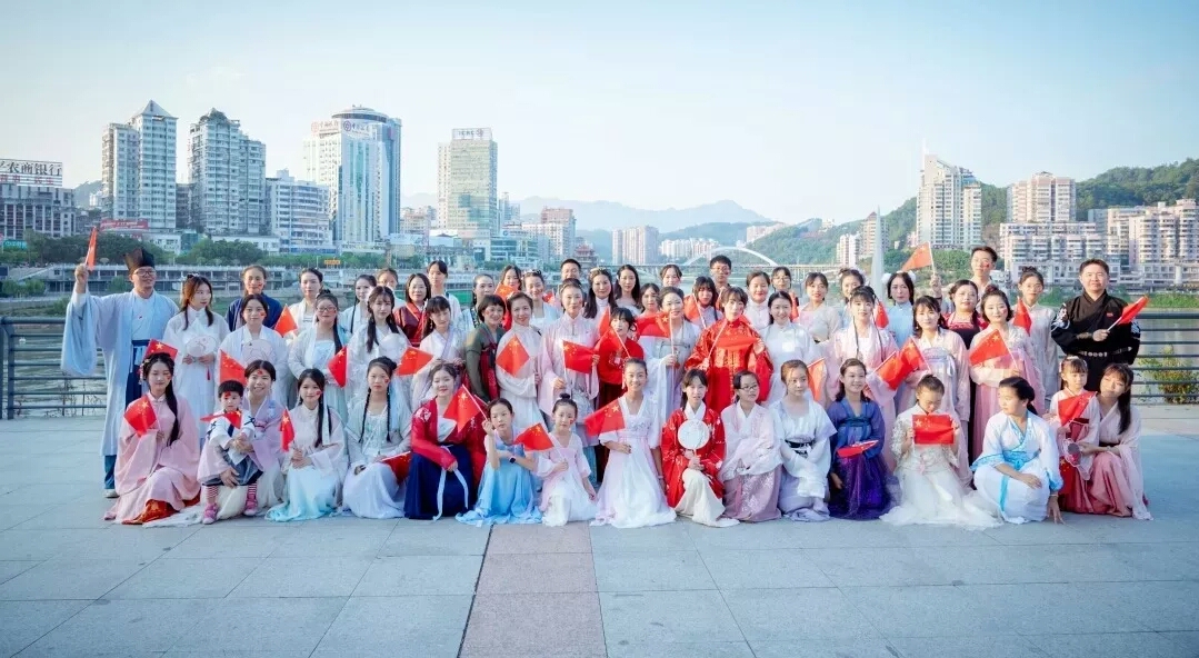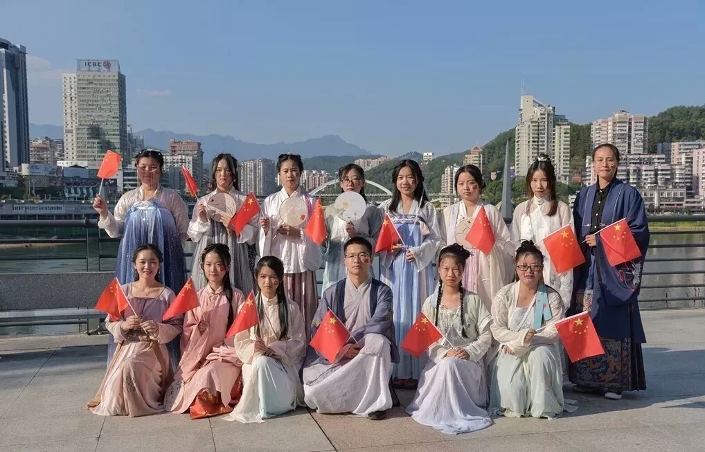 学院林学系汉服协会的师生穿起汉服在闽江的起点“双剑化龙”前唱响“我和我的祖国”。