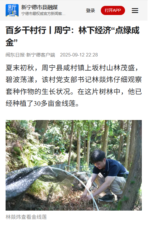 多年前,福建林业职业技术学院森林资源保护专业毕业生林燚炜以乡村振兴大学生志愿者的身份服务周宁县李墩镇。他利用知识为当地农民提供农业技术支持,与团队成员搭建植物组培室,开展金线莲等中草药种苗培育,辐射带动李墩东山等村群众种植。多年后,他又以村干部身份回到家乡——咸村上坂,致力带动群众发展林下经济。