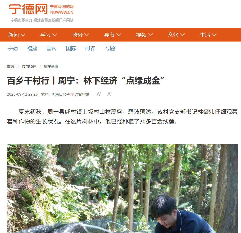 截至2025年7月,该县林下经济经营和利用林地面积达9.8万亩,培育林业企业及农民专业合作社300余家,吸引从业人数近万人,生态红利惠及广大群众,形成林下种植、林下养殖、采集加工、景观利用等多元发展模式。全县现有林下中药材基地15个,总面积达1539亩,主要种植黄精、草珊瑚、铁皮石斛、金线莲、紫灵芝等品种;林下养殖则以生态土鸡与肉羊为主,初步构建起养殖销售产业链。此外,周宁县还通过培育电商主体等方式,进一步畅通销售渠道,推动林下产品多方式“出山进城”。