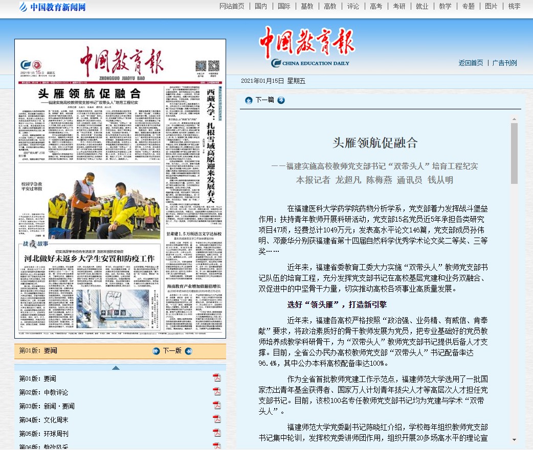 “双带头人”教师党支部书记,既要政治强,又要业务精。福建坚持围绕中心抓党建、抓好党建促发展,唱好“基本功”,推动党建工作与教学科研工作相互结合、有机融入,实现党务和业务同向发力、联动提升,破除党建与教学科研相脱离的“两张皮”现象以及党建工作被虚化问题,把党组织的领导力和组织力转化为推进课堂教学、科研立项、组建团队、海外研修等工作强大动力,不断提高教学科研水平。